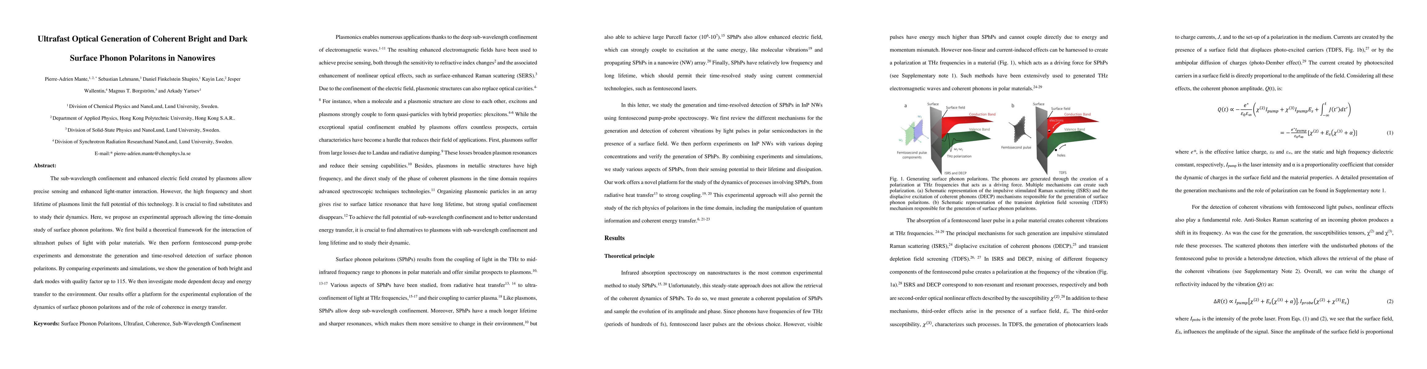 This paper demonstrates the use of ultrafast visible lasers to generate coherent bright and dark surface phonon polaritons in nanowires, revealing their generation via ultrafast screening of the surface depletion field. The findings suggest a potential pathway for exploring coherence in polariton physics.