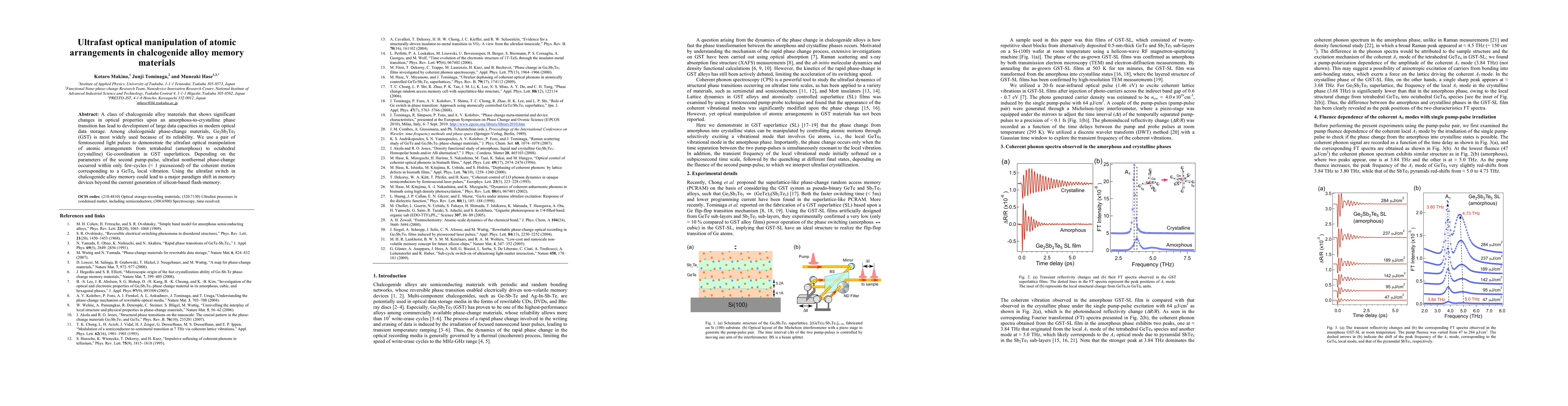 This paper demonstrates ultrafast optical manipulation of atomic arrangements in Ge2Sb2Te5 (GST) chalcogenide alloy memory materials using femtosecond light pulses, achieving nonthermal phase-change within ~1 ps. This breakthrough could revolutionize memory devices, surpassing current silicon-based flash-memory.