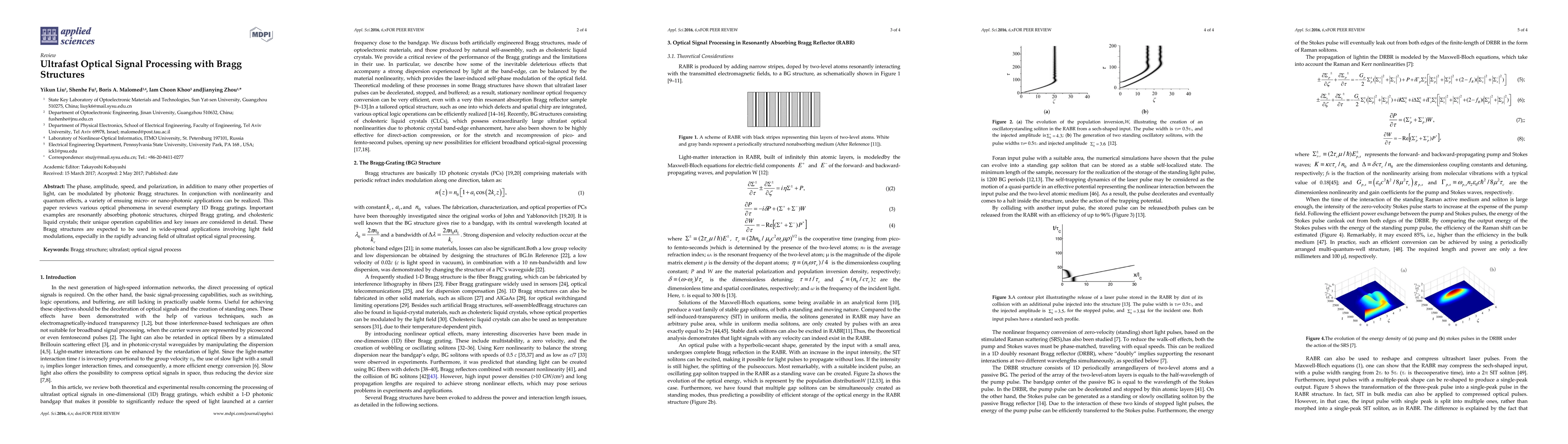 This paper reviews photonic Bragg structures' ability to modulate light's phase, amplitude, speed, and polarization, highlighting applications in ultrafast optical signal processing. It focuses on exemplary 1D Bragg gratings, including resonantly absorbing structures, chirped Bragg gratings, and cholesteric liquid crystals, discussing their unique operational capabilities and challenges.