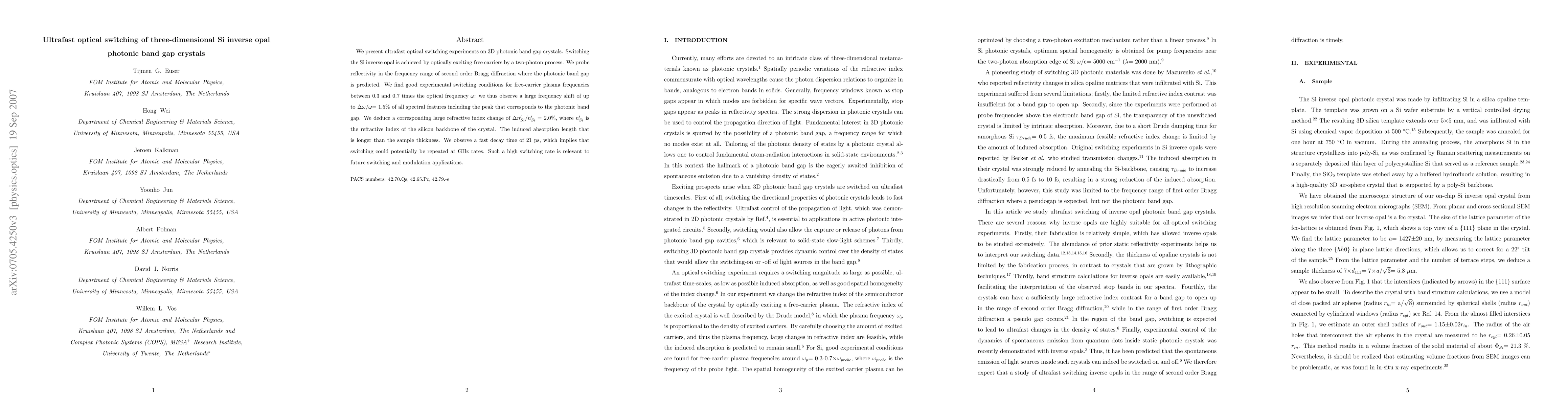 This paper reports on ultrafast optical switching in 3D Si inverse opal photonic band gap crystals, achieved by exciting free carriers via a two-photon process, resulting in a large refractive index change and a fast decay time of 21 ps, indicating potential for GHz-rate switching applications.