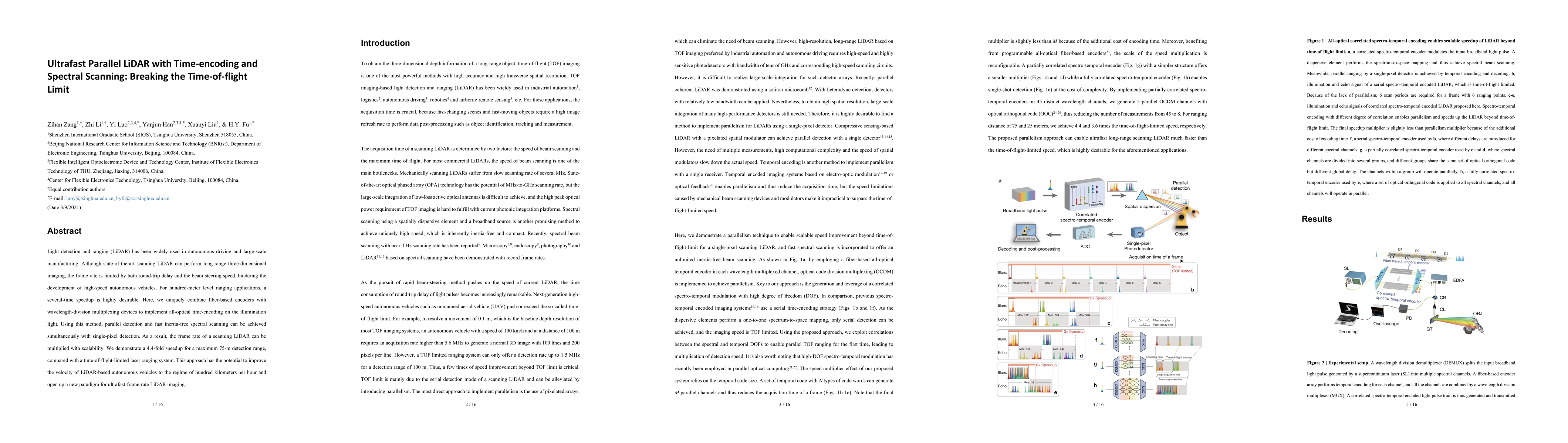 Light detection and ranging (LiDAR) has been widely used in autonomous driving and large-scale manufacturing. Although state-of-the-art scanning LiDAR can perform long-range three-dimensional imaging, the frame rate is limited by both round-trip delay and the beam steering speed, hindering the development of high-speed autonomous vehicles. For hundred-meter level ranging applications, a several-time speedup is highly desirable. Here, we uniquely combine fiber-based encoders with wavelength-division multiplexing devices to implement all-optical time-encoding on the illumination light. Using this method, parallel detection and fast inertia-free spectral scanning can be achieved simultaneously with single-pixel detection. As a result, the frame rate of a scanning LiDAR can be multiplied with scalability. We demonstrate a 4.4-fold speedup for a maximum 75-m detection range, compared with a time-of-flight-limited laser ranging system. This approach has the potential to improve the velocity of LiDAR-based autonomous vehicles to the regime of hundred kilometers per hour and open up a new paradigm for ultrafast-frame-rate LiDAR imaging.