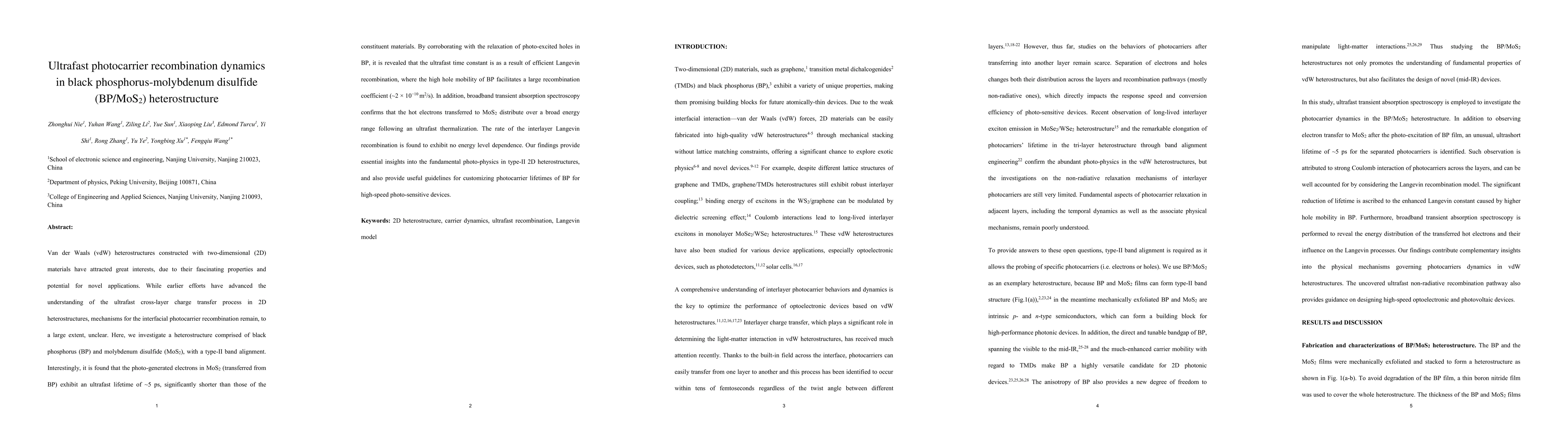 This paper investigates the ultrafast recombination dynamics in a black phosphorus (BP) and molybdenum disulfide (MoS2) heterostructure, revealing efficient Langevin recombination facilitated by BP's high hole mobility, with electrons transferred from BP to MoS2 exhibiting a recombination lifetime of about 5 ps, providing insights into the fundamental photo-physics of type-II 2D heterostructures.