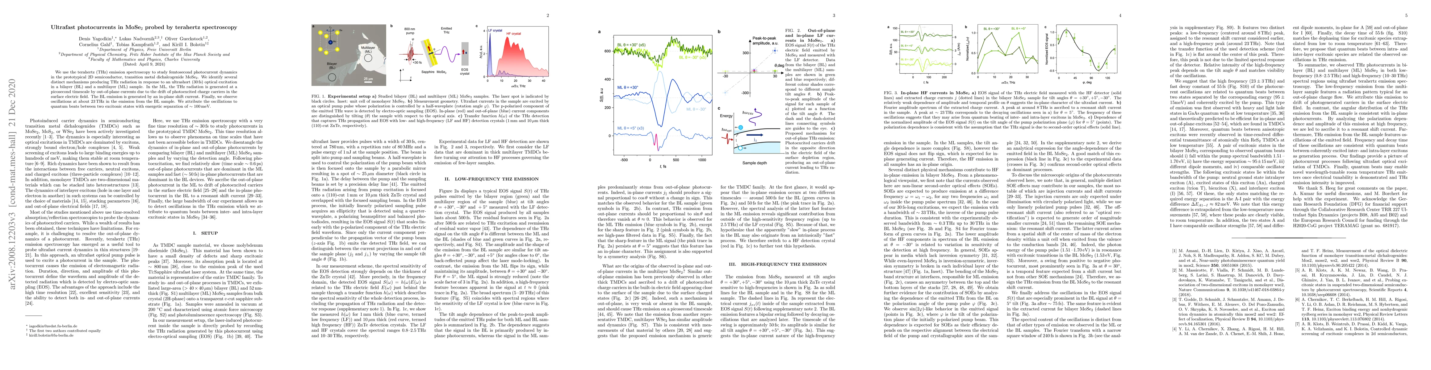 We use the terahertz (THz) emission spectroscopy to study femtosecond photocurrent dynamics in the prototypical 2D semiconductor, transition metal dichalcogenide MoSe$_2$. We identify several distinct mechanisms producing THz radiation in response to an ultrashort ($30\,$fs) optical excitation in a bilayer (BL) and a multilayer (ML) sample. In the ML, the THz radiation is generated at a picosecond timescale by out-of-plane currents due to the drift of photoexcited charge carriers in the surface electric field. The BL emission is generated by an in-plane shift current. Finally, we observe oscillations at about $23\,$THz in the emission from the BL sample. We attribute the oscillations to quantum beats between two excitonic states with energetic separation of $\sim100\,$meV.