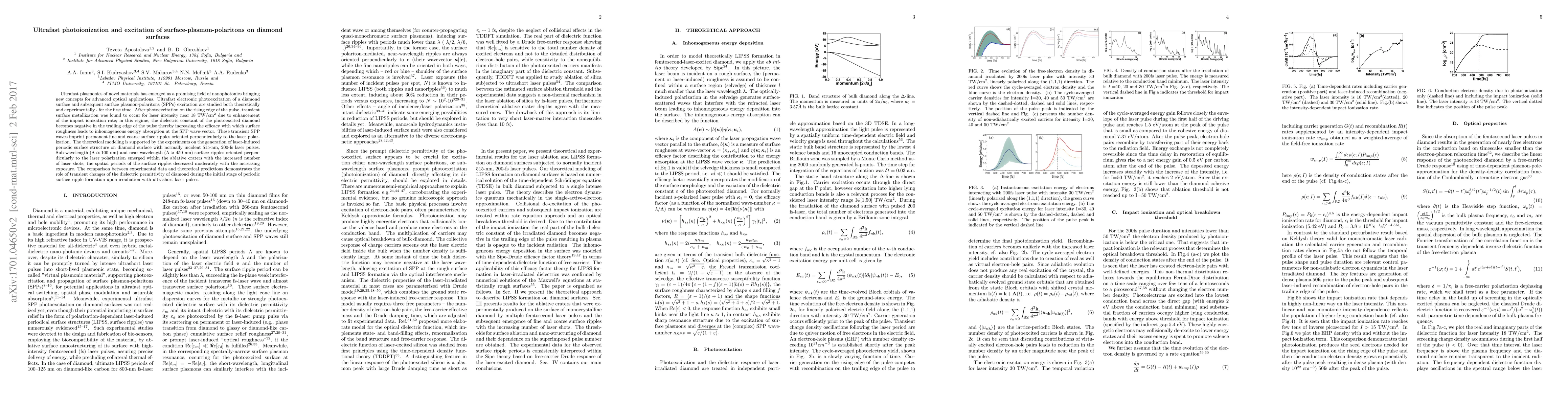 This paper investigates ultrafast photoionization and excitation of surface-plasmon-polaritons (SPPs) on diamond surfaces, revealing transient surface metallization and negative dielectric constant enhancement at high laser intensities. The study combines theoretical modeling and experimental results showing the formation of laser-induced periodic surface structures on diamond, with ripples oriented perpendicular to laser polarization.