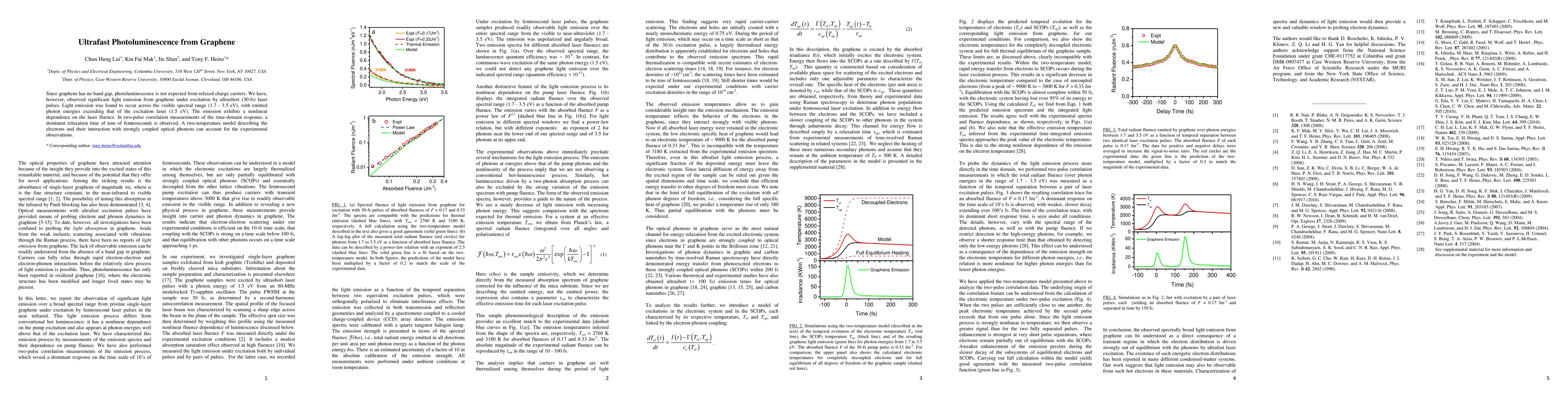 Summary: Ultrafast photoluminescence in graphene, despite its lack of a band gap, is observed under femtosecond laser excitation, showing emission across the visible spectrum and a relaxation time of tens of femtoseconds, explained by a two-temperature model involving electron-phonon interactions.