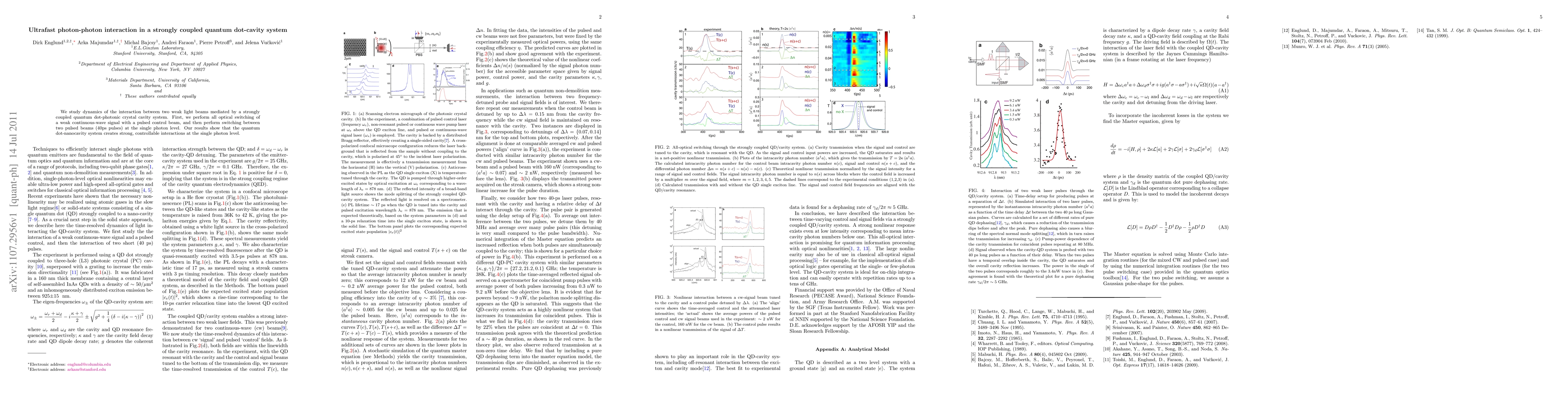 This research investigates ultrafast photon-photon interactions within a quantum dot-photonic crystal cavity system, demonstrating all-optical switching of single photons using 40 ps pulsed beams, showcasing strong, controllable interactions at the single photon level.