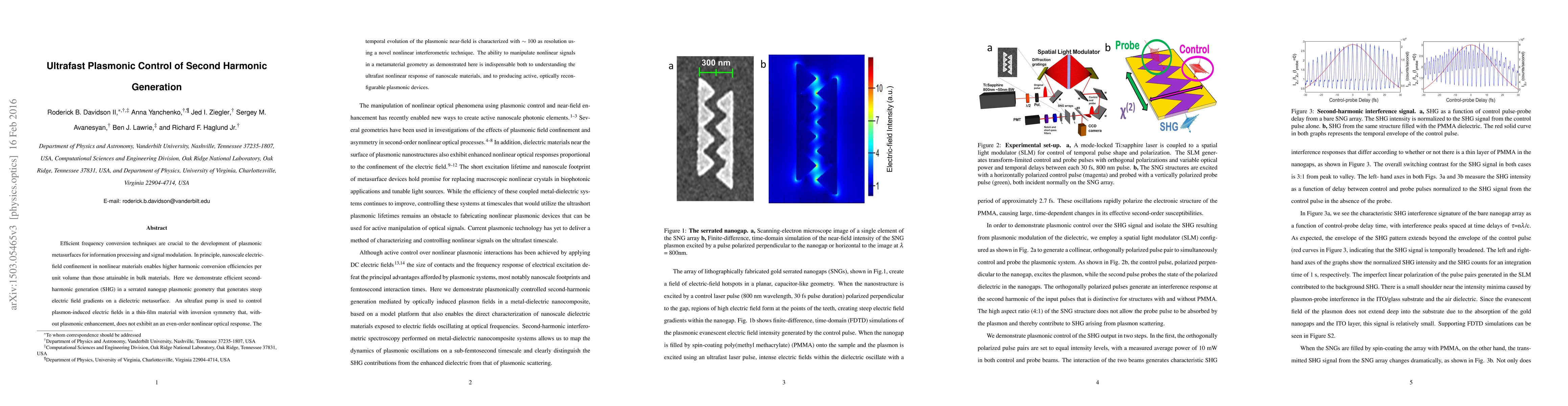 Efficient frequency conversion techniques are crucial to the development of plasmonic metasurfaces for information processing and signal modulation. In principle, nanoscale electric-field confinement in nonlinear materials enables higher harmonic conversion efficiencies per unit volume than those attainable in bulk materials. Here we demonstrate efficient second-harmonic generation (SHG) in a serrated nanogap plasmonic geometry that generates steep electric field gradients on a dielectric metasurface. An ultrafast pump is used to control plasmon-induced electric fields in a thin-film material with inversion symmetry that, without plasmonic enhancement, does not exhibit an an even-order nonlinear optical response. The temporal evolution of the plasmonic near-field is characterized with ~100as resolution using a novel nonlinear interferometric technique. The ability to manipulate nonlinear signals in a metamaterial geometry as demonstrated here is indispensable both to understanding the ultrafast nonlinear response of nanoscale materials, and to producing active, optically reconfigurable plasmonic devices