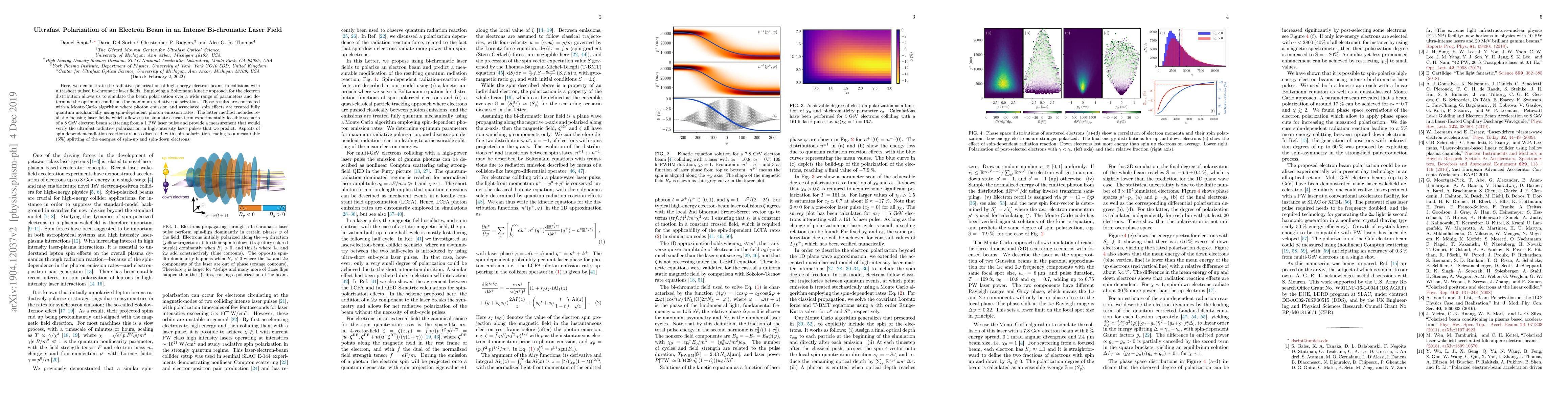 This paper demonstrates the ultrafast polarization of high-energy electron beams via interactions with intense bi-chromatic laser fields, using both Boltzmann kinetic and Monte-Carlo simulations. The results predict a measurable energy splitting of 5% between spin-up and spin-down electrons, offering a feasible experimental verification scenario.