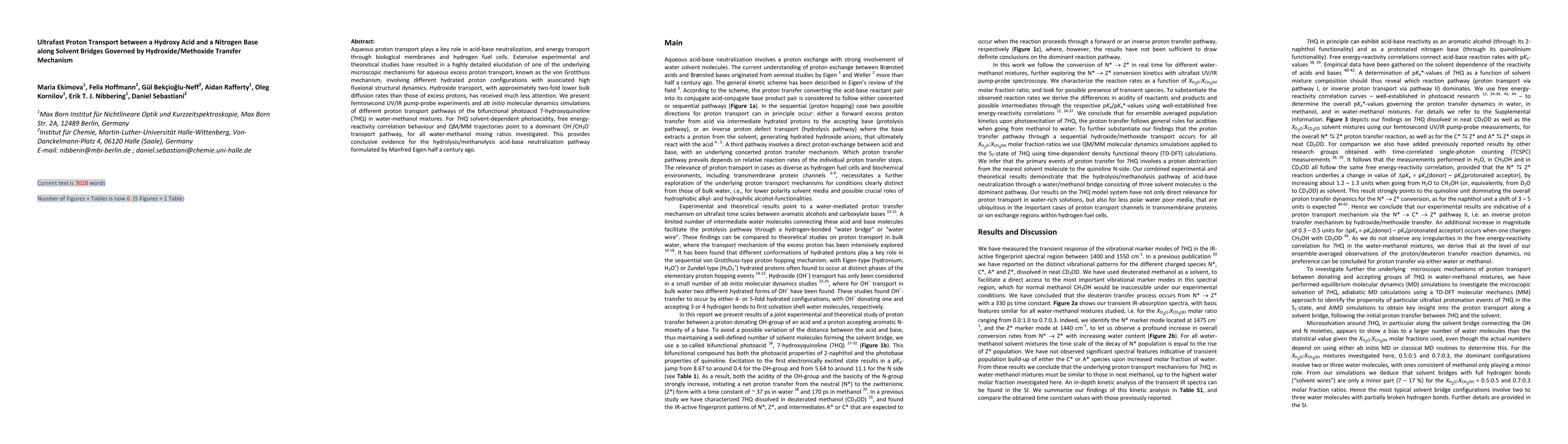 This paper investigates ultrafast proton transport mechanisms in aqueous solutions using femtosecond UV/IR experiments and simulations, revealing a dominant hydroxide/methoxide transfer pathway in water-methanol mixtures. The study supports the von Grotthuss mechanism and validates Manfred Eigen's proposed hydrolysis/methanolysis acid-base neutralization pathway.