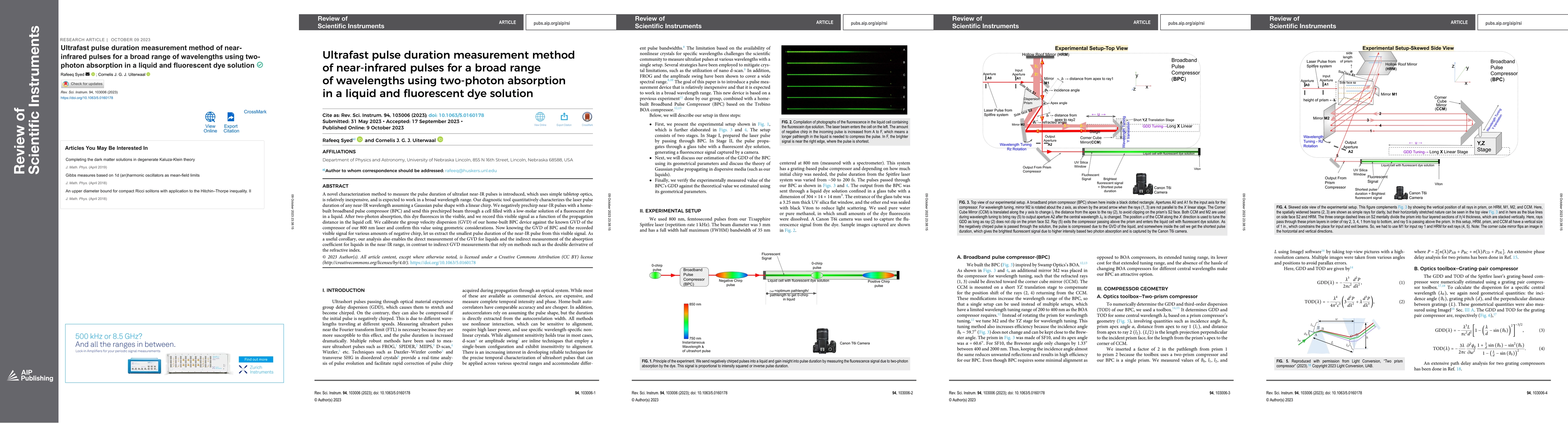 A novel characterization method to measure the pulse duration of ultrafast near-IR pulses is introduced, which uses simple tabletop optics, is relatively inexpensive, and is expected to work in a broad wavelength range. Our diagnostic tool quantitatively characterizes the laser pulse duration of any near-IR wavelength assuming a Gaussian pulse shape with a linear chirp. We negatively prechirp near-IR pulses with a home-built broadband pulse compressor (BPC) and send this prechirped beam through a cell filled with a low-molar solution of a fluorescent dye in a liquid. After two-photon absorption, this dye fluoresces in the visible, and we record this visible signal as a function of the propagation distance in the liquid cell. We calibrate the group velocity dispersion (GVD) of our home-built BPC device against the known GVD of the compressor of our 800 nm laser and confirm this value using geometric considerations. Now knowing the GVD of BPC and the recorded visible signal for various amounts of negative chirp, let us extract the smallest pulse duration of the near-IR pulse from this visible signal. As a useful corollary, our analysis also enables the direct measurement of the GVD for liquids and the indirect measurement of the absorption coefficient for liquids in the near-IR range, in contrast to indirect GVD measurements that rely on methods such as the double derivative of the refractive index.