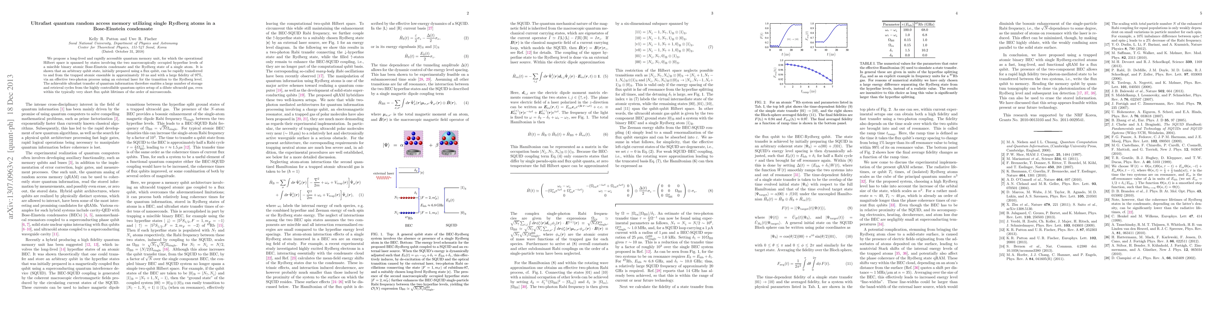 This paper proposes a quantum random access memory utilizing single Rydberg atoms in a Bose-Einstein condensate, achieving rapid and high-fidelity transfer of qubit states in approximately 10 ns using a two-photon process, enabling numerous storage cycles in a controlled quantum optics setup.
