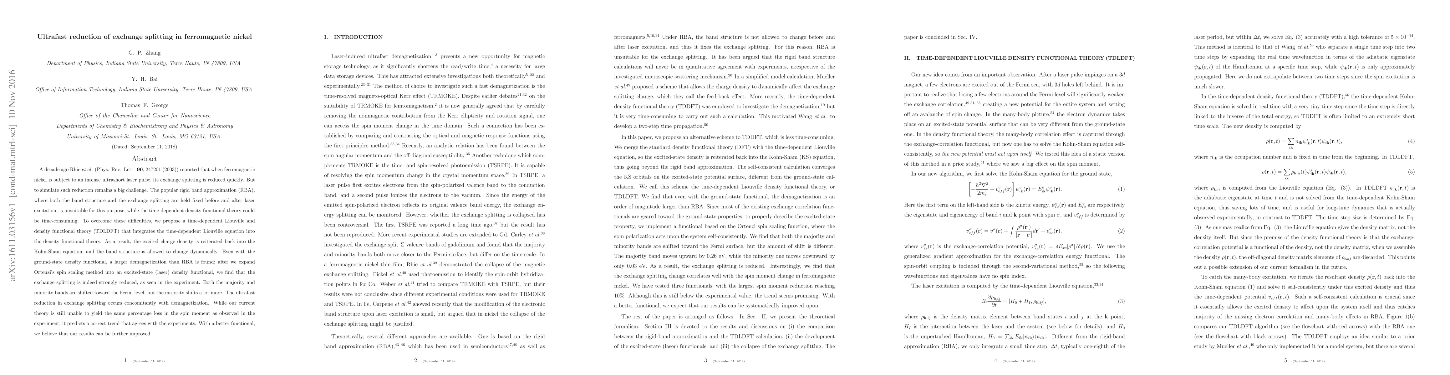 A decade ago Rhie \et (Phys. Rev. Lett. {\bf 90}, 247201 (2003)) reported that when ferromagnetic nickel is subject to an intense ultrashort laser pulse, its exchange splitting is reduced quickly. But to simulate such reduction remains a big challenge. The popular rigid band approximation (RBA), where both the band structure and the exchange splitting are held fixed before and after laser excitation, is unsuitable for this purpose, while the time-dependent density functional theory could be time-consuming. To overcome these difficulties, we propose a time-dependent Liouville and density functional theory (TDLDFT) that integrates the time-dependent Liouville equation into the density functional theory. As a result, the excited charge density is reiterated back into the Kohn-Sham equation, and the band structure is allowed to change dynamically. Even with the ground-state density functional, a larger demagnetization than RBA is found; after we expand Ortenzi's spin scaling method into an excited-state (laser) density functional, we find that the exchange splitting is indeed strongly reduced, as seen in the experiment. Both the majority and minority bands are shifted toward the Fermi level, but the majority shifts a lot more. The ultrafast reduction in exchange splitting occurs concomitantly with demagnetization. While our current theory is still unable to yield the same percentage loss in the spin moment as observed in the experiment, it predicts a correct trend that agrees with the experiments. With a better functional, we believe that our results can be further improved.