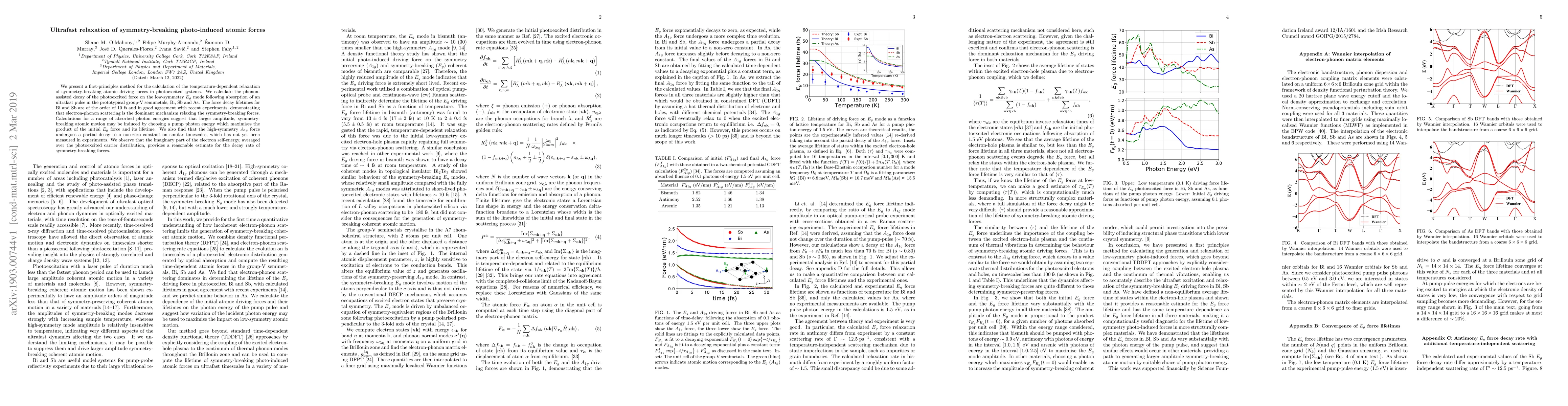 This paper introduces a first-principles method to calculate the relaxation of symmetry-breaking atomic forces in photoexcited systems, finding phonon-assisted decay in group-V semimetals Bi, Sb, and As. The calculated decay lifetimes for Bi and Sb align well with experimental data, indicating electron-phonon scattering as the primary relaxation mechanism.