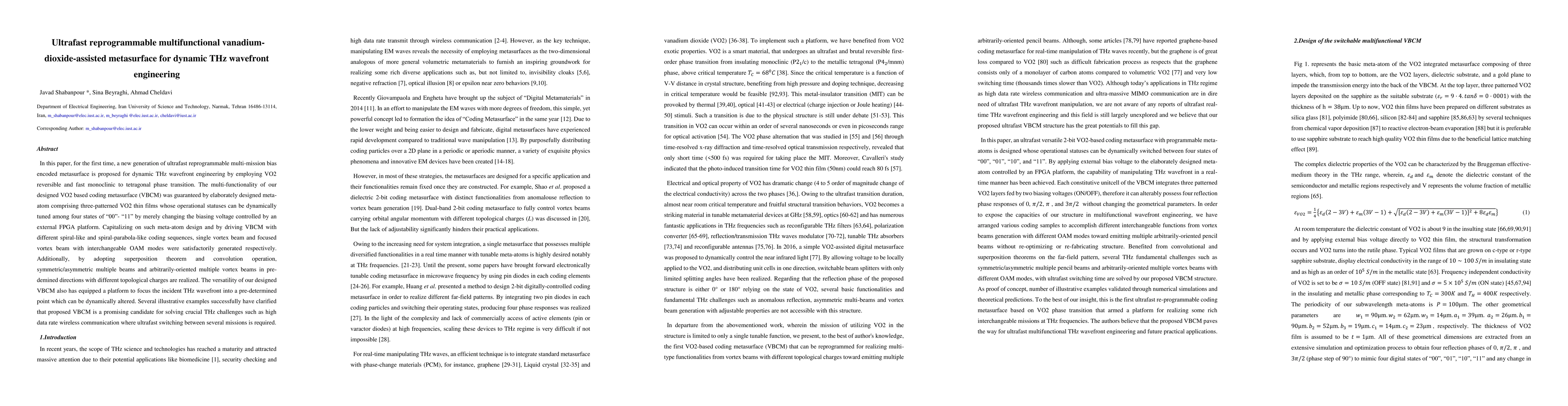 This paper introduces an ultrafast reprogrammable metasurface using vanadium dioxide (VO2) for dynamic THz wavefront engineering, leveraging its phase transition. The proposed VO2-based coding metasurface (VBCM) dynamically tunes its operational states via biasing voltage, enabling the generation of single and focused vortex beams, multiple beams, and versatile wavefront manipulation, promising applications in high-speed wireless communication.
