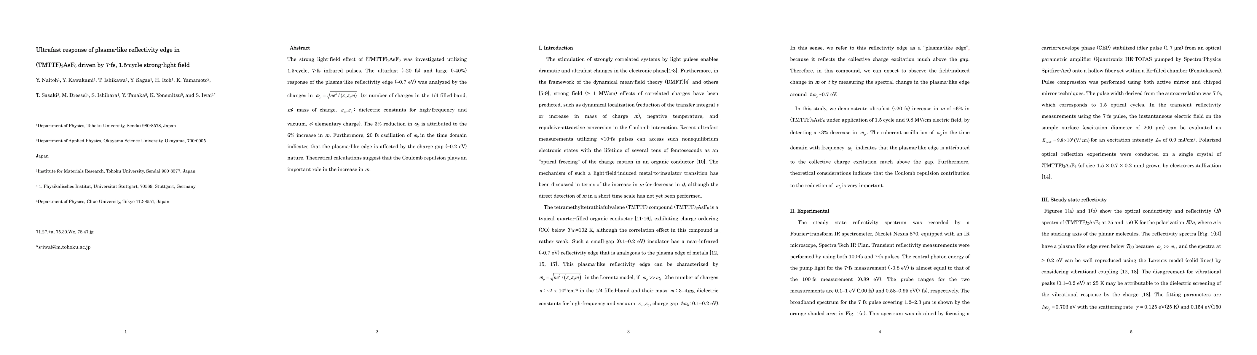 The study investigates the strong light-field effect on (TMTTF)2AsF6 using 1.5-cycle, 7-fs infrared pulses, analyzing the ultrafast (20 fs) and large (40%) response of the plasma-like reflectivity edge (0.7 eV) through changes in omega_p.