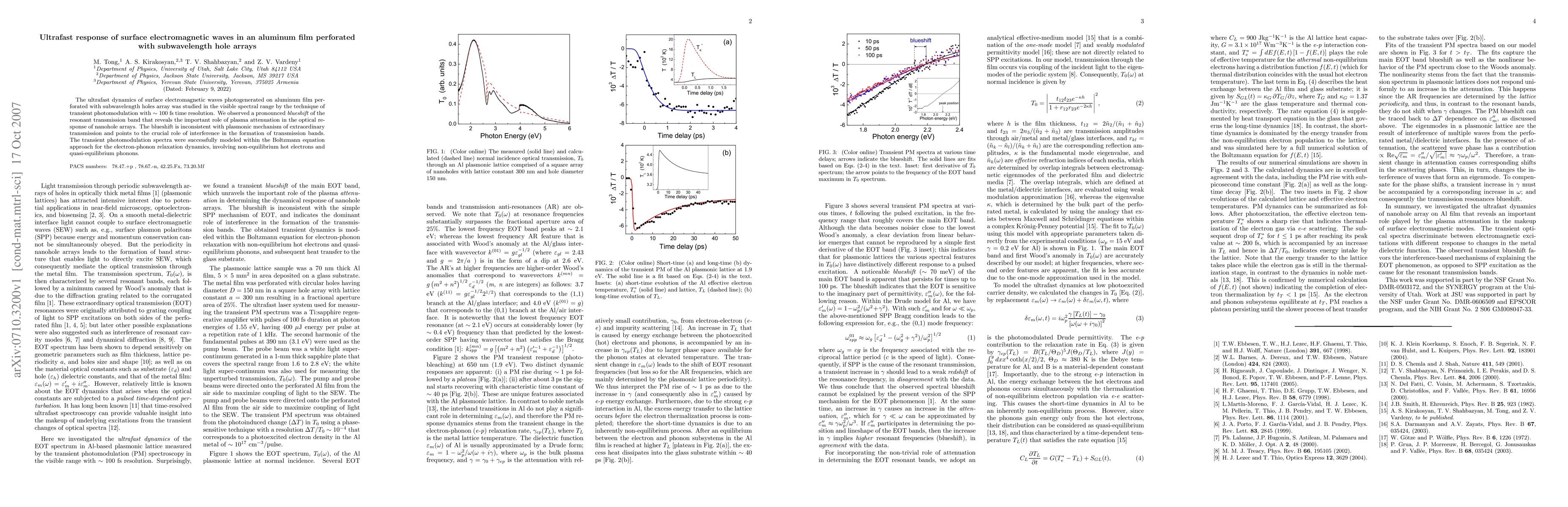 Research shows that aluminum films with subwavelength hole arrays exhibit ultrafast surface electromagnetic waves, with a pronounced blueshift in their transmission band due to plasma attenuation. This finding highlights the crucial role of interference in forming transmission bands, contradicting traditional plasmonic theories.