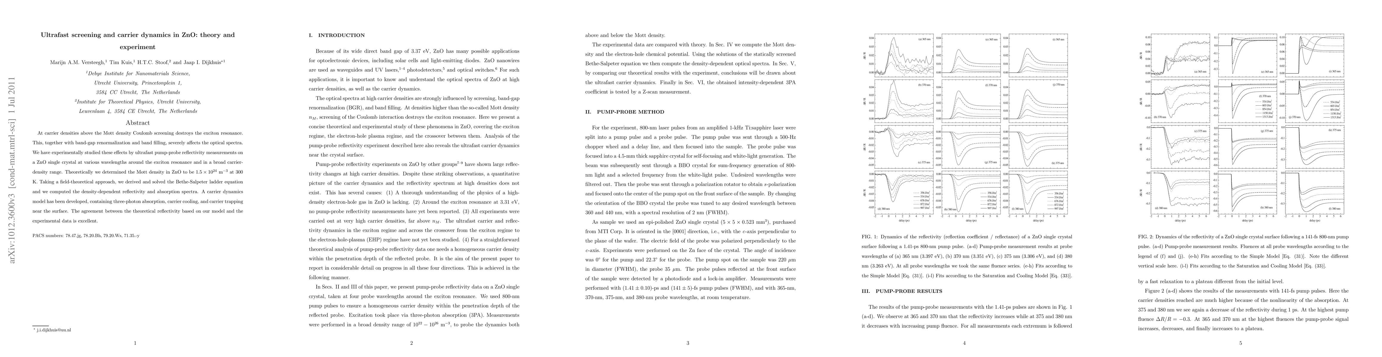 At carrier densities above the Mott density Coulomb screening destroys the exciton resonance. This, together with band-gap renormalization and band filling, severely affects the optical spectra. We have experimentally studied these effects by ultrafast pump-probe reflectivity measurements on a ZnO single crystal at various wavelengths around the exciton resonance and in a broad carrier-density range. Theoretically we determined the Mott density in ZnO to be $1.5\times10^{24}$ m$^{-3}$ at 300 K. Taking a field-theoretical approach, we derived and solved the Bethe-Salpeter ladder equation and we computed the density-dependent reflectivity and absorption spectra. A carrier dynamics model has been developed, containing three-photon absorption, carrier cooling, and carrier trapping near the surface. The agreement between the theoretical reflectivity based on our model and the experimental data is excellent.