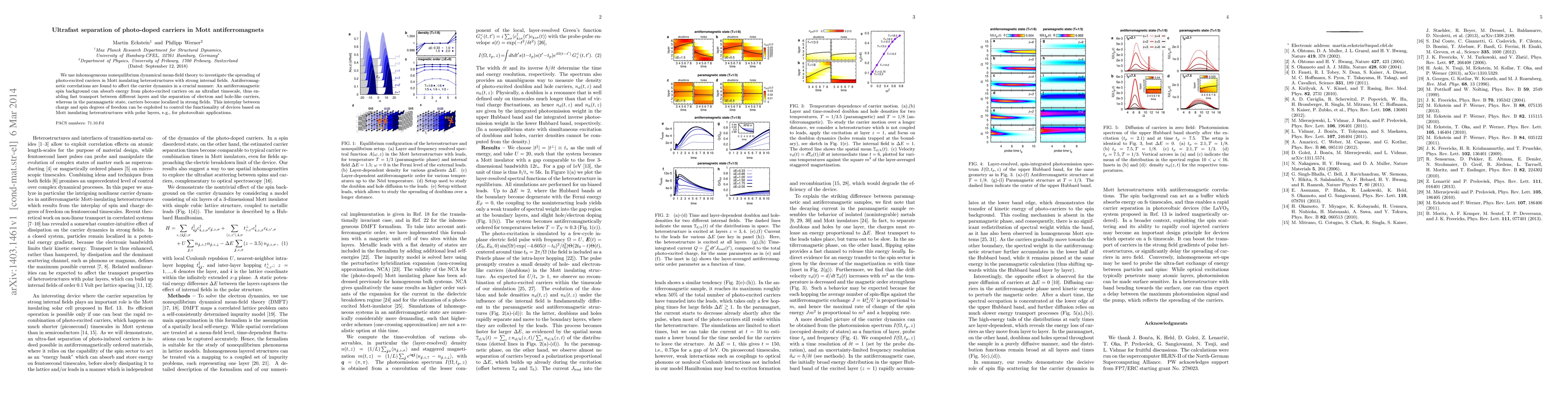 This paper investigates the ultrafast separation of photo-doped carriers in Mott insulating heterostructures using nonequilibrium dynamical mean-field theory, revealing that antiferromagnetic spin correlations enable rapid carrier transport and separation on ultrafast timescales. The study highlights the potential to control device functionality in photovoltaic applications through this interplay between charge and spin dynamics.