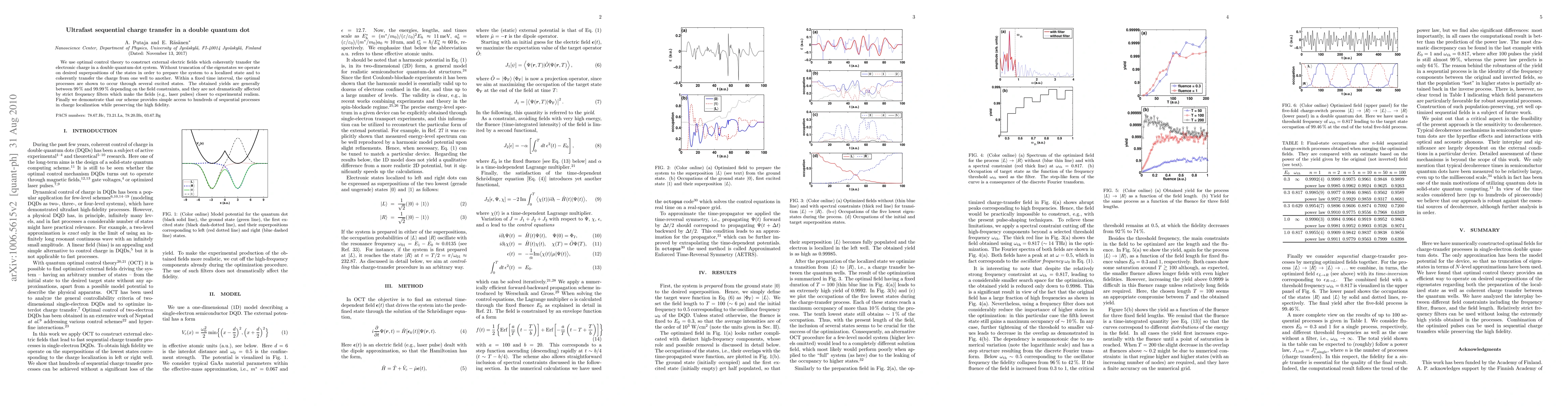 We use optimal control theory to construct external electric fields which coherently transfer the electronic charge in a double quantum-dot system. Without truncation of the eigenstates we operate on desired superpositions of the states in order to prepare the system to a localized state and to coherently transfer the charge from one well to another. Within a fixed time interval, the optimal processes are shown to occur through several excited states. The obtained yields are generally between 99% and 99.99% depending on the field constraints, and they are not dramatically affected by strict frequency filters which make the fields (e.g., laser pulses) closer to experimental realism. Finally we demonstrate that our scheme provides simple access to hundreds of sequential processes in charge localization while preserving the high fidelity.