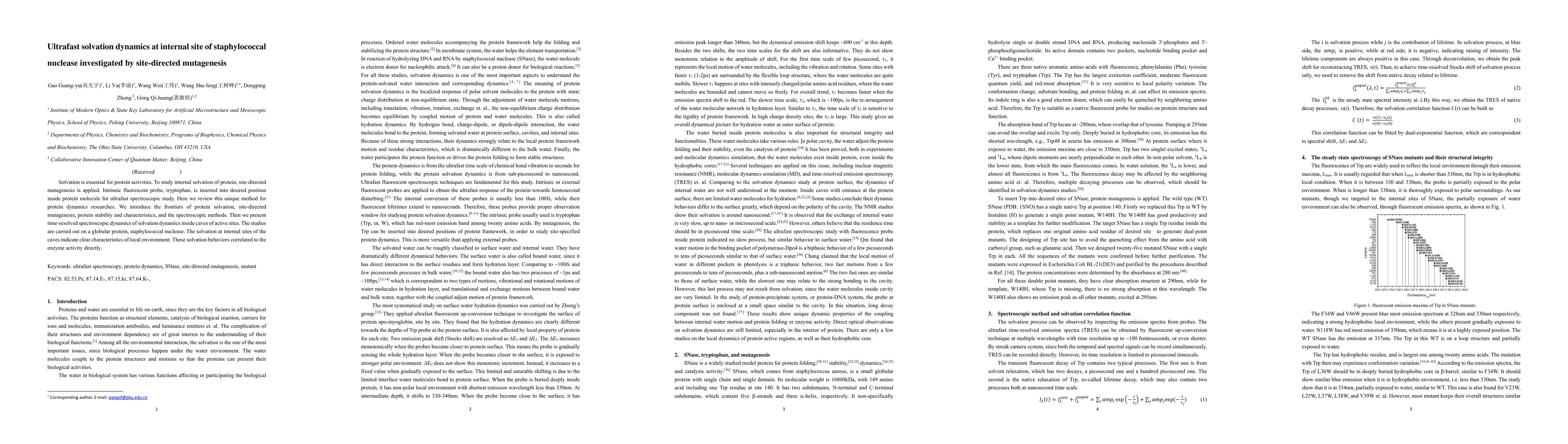 This paper investigates ultrafast solvation dynamics within the internal sites of staphylococcal nuclease using site-directed mutagenesis and intrinsic fluorescent probes. The study reveals distinct solvation behaviors linked to enzyme activity, highlighting the method's potential for protein dynamics research.
