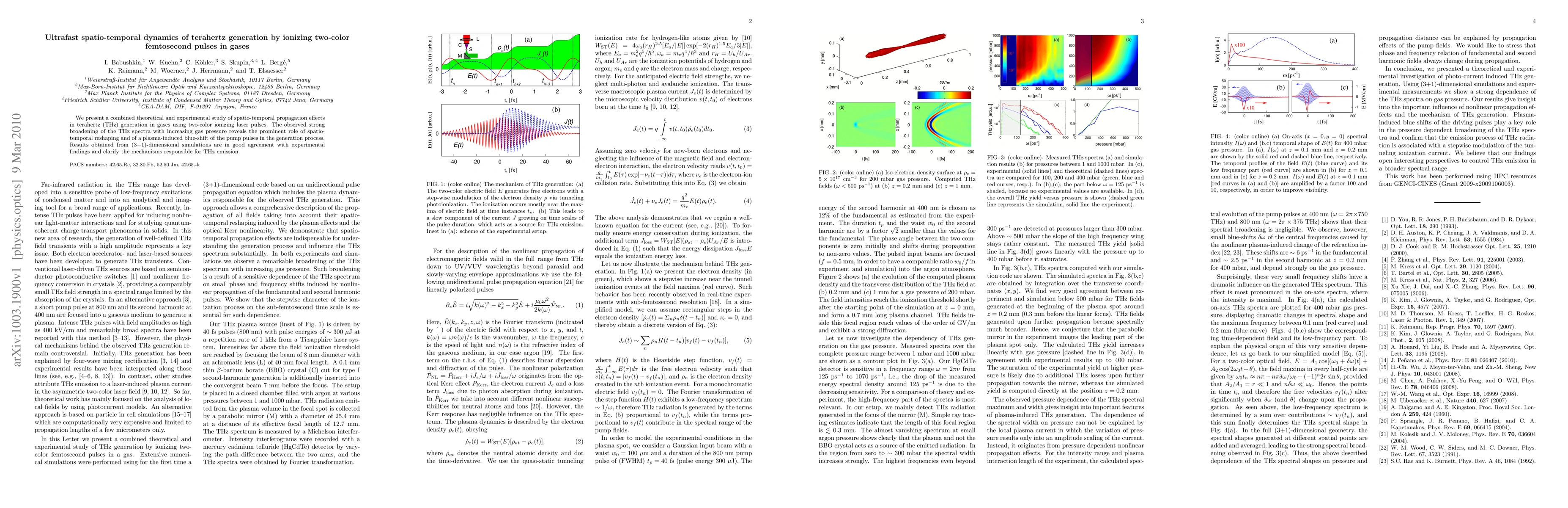 This paper investigates the spatio-temporal dynamics of terahertz generation in gases using two-color femtosecond laser pulses, revealing significant broadening of THz spectra with gas pressure due to reshaping and plasma-induced blue-shift. The study combines theoretical simulations and experimental results to elucidate the underlying mechanisms of THz emission.