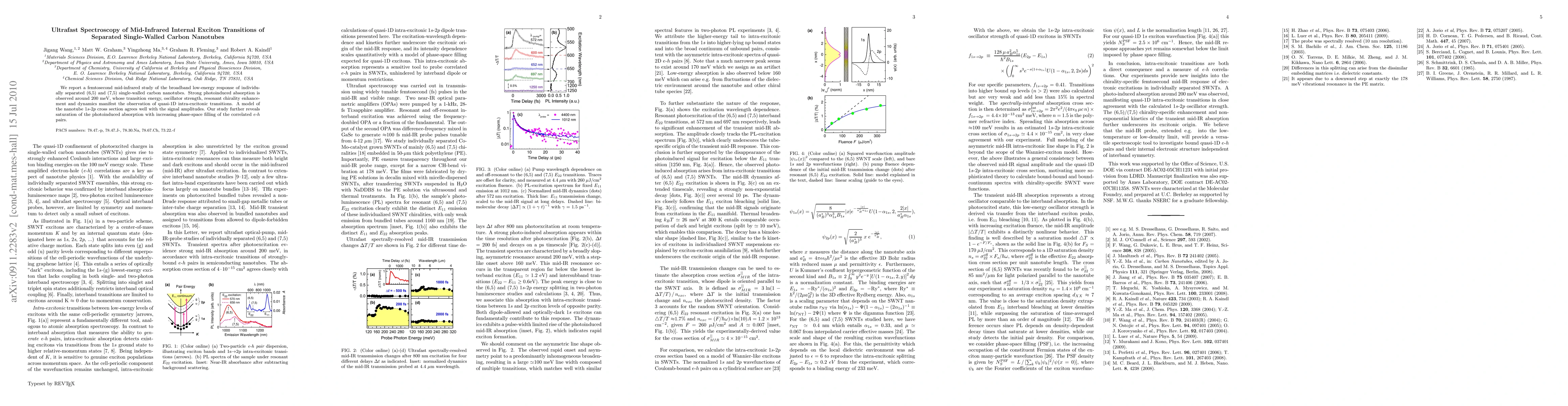 We report a femtosecond mid-infrared study of the broadband low-energy response of individually separated (6,5) and (7,5) single-walled carbon nanotubes. Strong photoinduced absorption is observed around 200 meV, whose transition energy, oscillator strength, resonant chirality enhancement and dynamics manifest the observation of quasi-1D intra-excitonic transitions. A model of the nanotube 1s-2p cross section agrees well with the signal amplitudes. Our study further reveals saturation of the photoinduced absorption with increasing phase-space filling of the correlated e-h pairs.