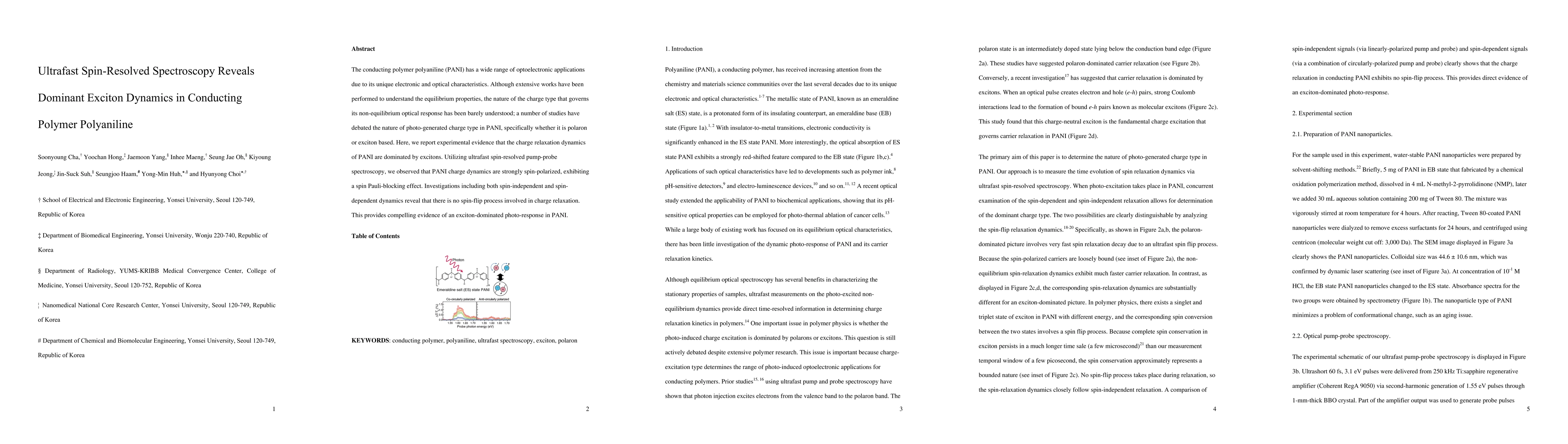 This research reveals that in conducting polymer polyaniline (PANI), the charge relaxation dynamics are dominated by excitons, not polarons, through ultrafast spin-resolved spectroscopy, which shows strong spin-polarized dynamics without spin-flip processes.