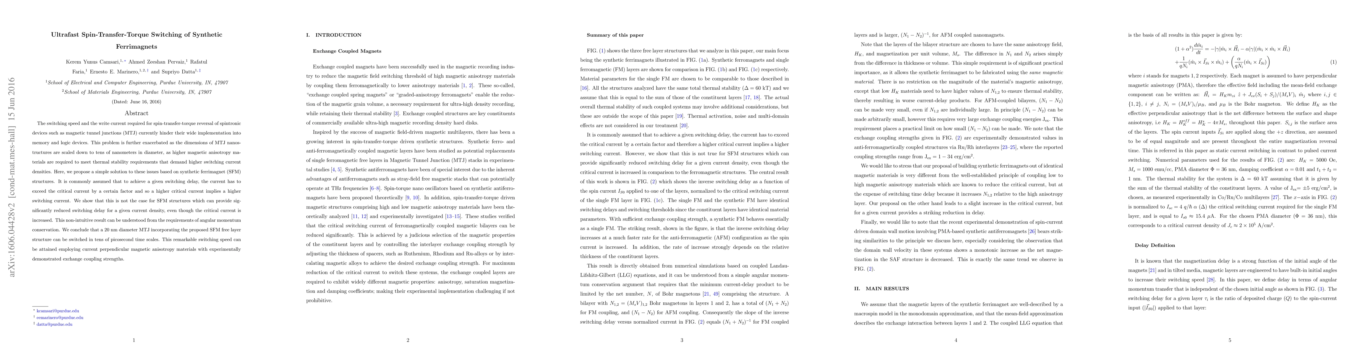 This paper proposes synthetic ferrimagnet structures to significantly reduce the switching delay of spintronic devices, achieving ultrafast spin-transfer-torque switching at reduced current densities. The study demonstrates that synthetic ferrimagnets can switch in tens of picoseconds, overcoming the limitations of conventional materials.