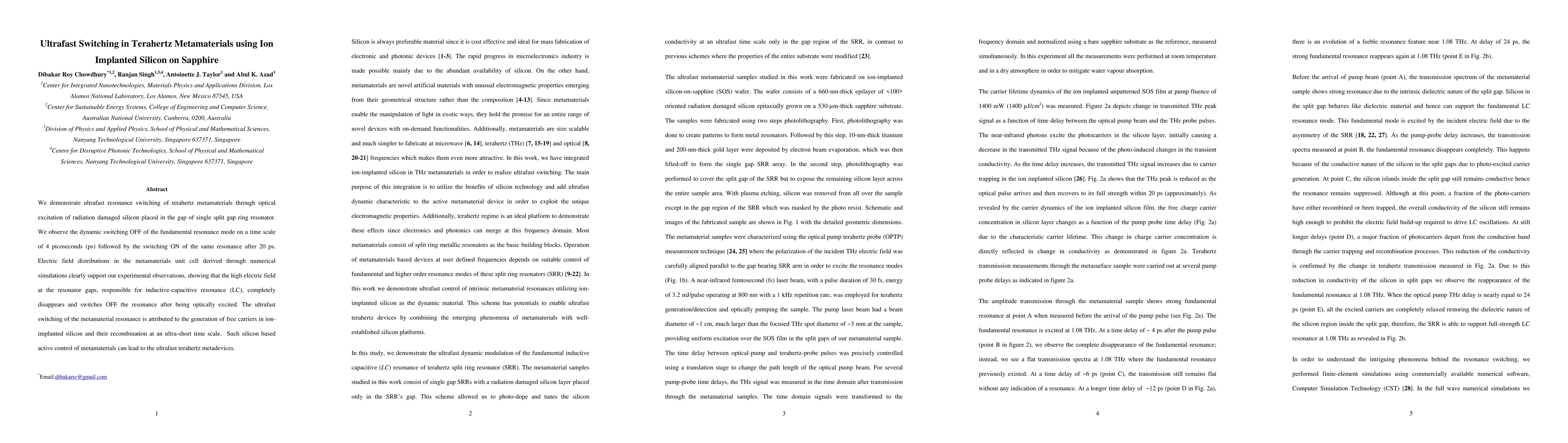This paper demonstrates ultrafast switching of terahertz metamaterials using ion-implanted silicon on sapphire, achieving resonance switching on a 4 ps time scale through optical excitation. The dynamic switching behavior is attributed to the generation and recombination of free carriers in the silicon.