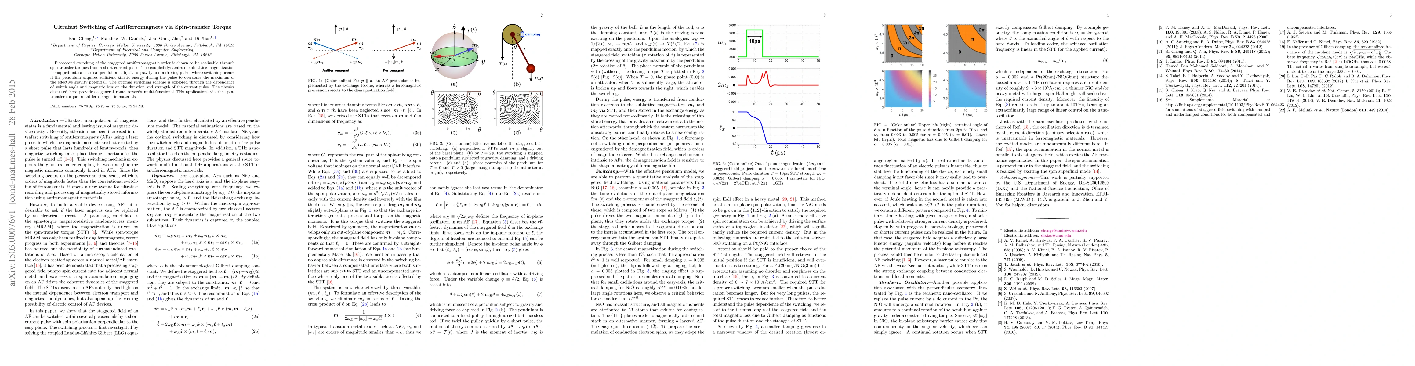 This paper demonstrates picosecond switching of antiferromagnetic order using spin-transfer torque from short current pulses, likening the dynamics to a pendulum overcoming a potential barrier. The study explores optimal switching conditions and suggests a pathway for THz applications in antiferromagnetic materials.