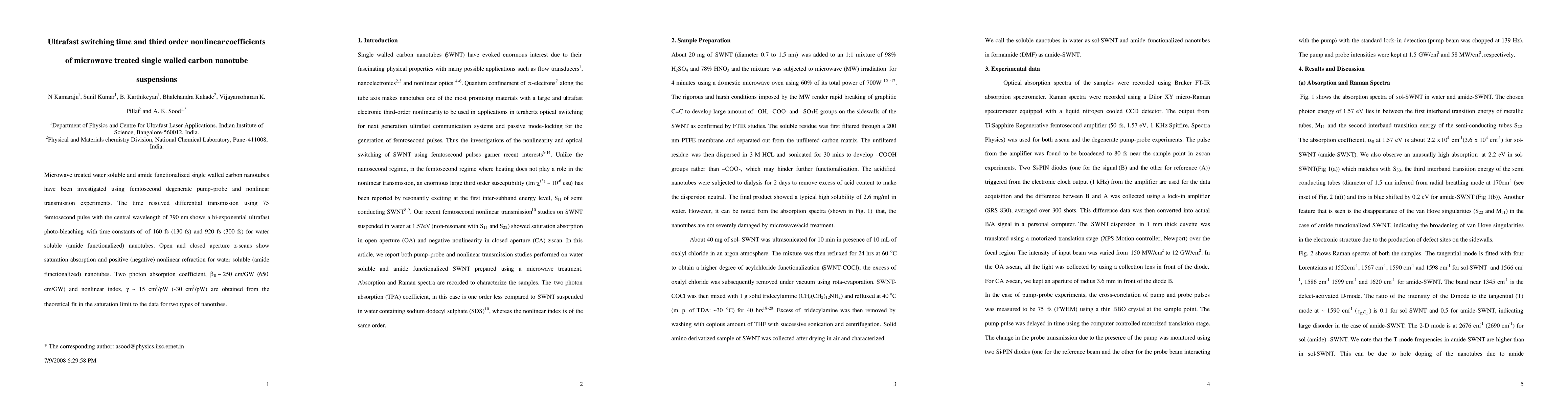Microwave treated water soluble and amide functionalized single walled carbon nanotubes have been investigated using femtosecond degenerate pump-probe and nonlinear transmission experiments. The time resolved differential transmission using 75 femtosecond pulse with the central wavelength of 790 nm shows a bi-exponential ultrafast photo-bleaching with time constants of of 160 fs (130 fs) and 920 fs (300 fs) for water soluble (amide functionalized) nanotubes. Open and closed aperture z-scans show saturation absorption and positive (negative) nonlinear refraction for water soluble (amide functionalized) nanotubes. Two photon absorption coefficient,beata ~250 cm/GW (650 cm/GW) and nonlinear index, gamma ~ 15 cm^2/pW (-30 cm^2/pW) are obtained from the theoretical fit in the saturation limit to the data for two types of nanotubes.