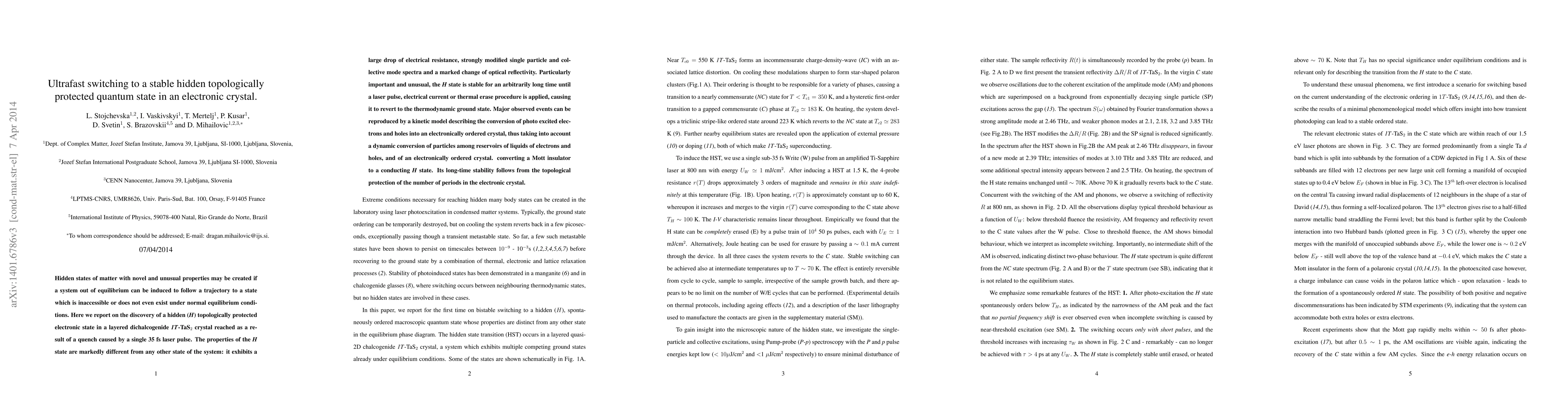 Hidden states of matter with novel and unusual properties may be created if a system out of equilibrium can be induced to follow a trajectory to a state which is inaccessible or does not even exist under normal equilibrium conditions. Here we report on the discovery of a hidden (H) topologically protected electronic state in a layered dichalcogenide 1T-TaS2 crystal reached as a result of a quench caused by a single 35 fs laser pulse. The properties of the H state are markedly different from any other state of the system: it exhibits a large drop of electrical resistance, strongly modified single particle and collective mode spectra and a marked change of optical reflectivity. Particularly important and unusual, the H state is stable for an arbitrarily long time until a laser pulse, electrical current or thermal erase procedure is applied, causing it to revert to the thermodynamic ground state. Major observed events can be reproduced by a kinetic model describing the conversion of photo excited electrons and holes into an electronically ordered crystal, thus converting a Mott insulator to a conducting H state. Its long-time stability follows from the topological protection of the number of periods in the electronic crystal.