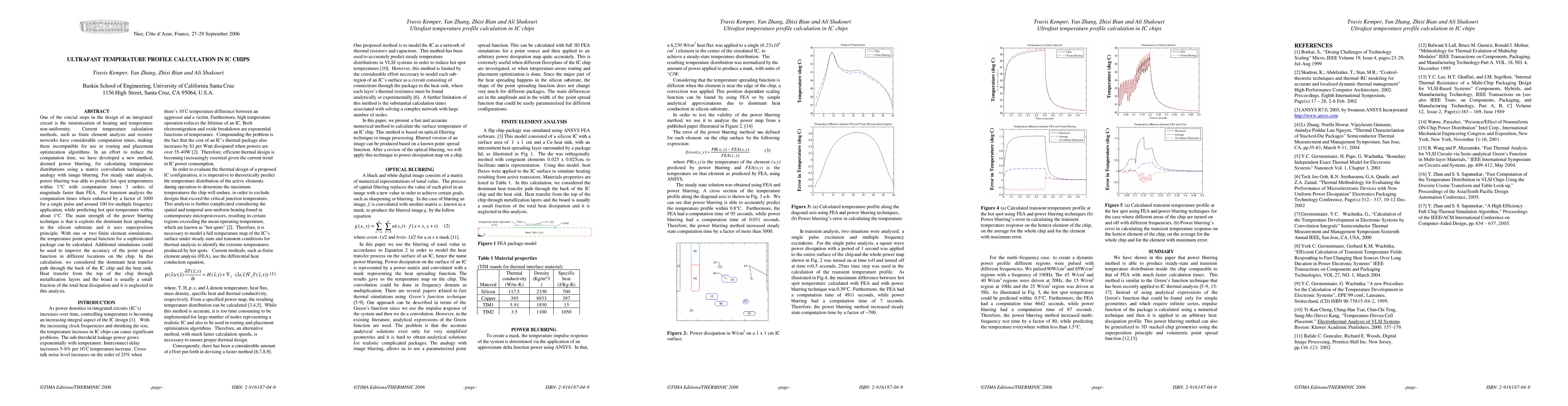 One of the crucial steps in the design of an integrated circuit is the minimization of heating and temperature non-uniformity. Current temperature calculation methods, such as finite element analysis and resistor networks have considerable computation times, making them incompatible for use in routing and placement optimization algorithms. In an effort to reduce the computation time, we have developed a new method, deemed power blurring, for calculating temperature distributions using a matrix convolution technique in analogy with image blurring. For steady state analysis, power blurring was able to predict hot spot temperatures within 1 degree C with computation times 3 orders of magnitude faster than FEA. For transient analysis the computation times where enhanced by a factor of 1000 for a single pulse and around 100 for multiple frequency application, while predicting hot spot temperature within about 1 degree C. The main strength of the power blurring technique is that it exploits the dominant heat spreading in the silicon substrate and it uses superposition principle. With one or two finite element simulations, the temperature point spread function for a sophisticated package can be calculated. Additional simulations could be used to improve the accuracy of the point spread function in different locations on the chip. In this calculation, we considered the dominant heat transfer path through the back of the IC chip and the heat sink. Heat transfer from the top of the chip through metallization layers and the board is usually a small fraction of the total heat dissipation and it is neglected in this analysis.