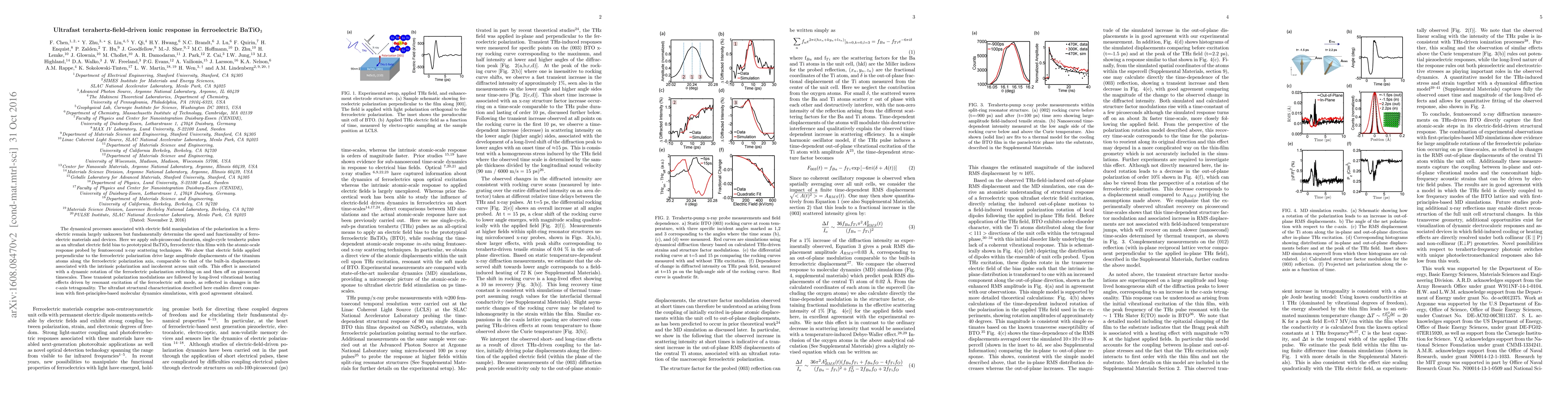 This paper investigates ultrafast terahertz-field-driven ionic responses in ferroelectric BaTiO$_3$ using sub-picosecond pulses and femtosecond x-ray scattering, revealing large titanium displacements and dynamic polarization rotations on picosecond timescales, followed by long-lived vibrational heating effects. The findings align well with first-principles molecular dynamics simulations.