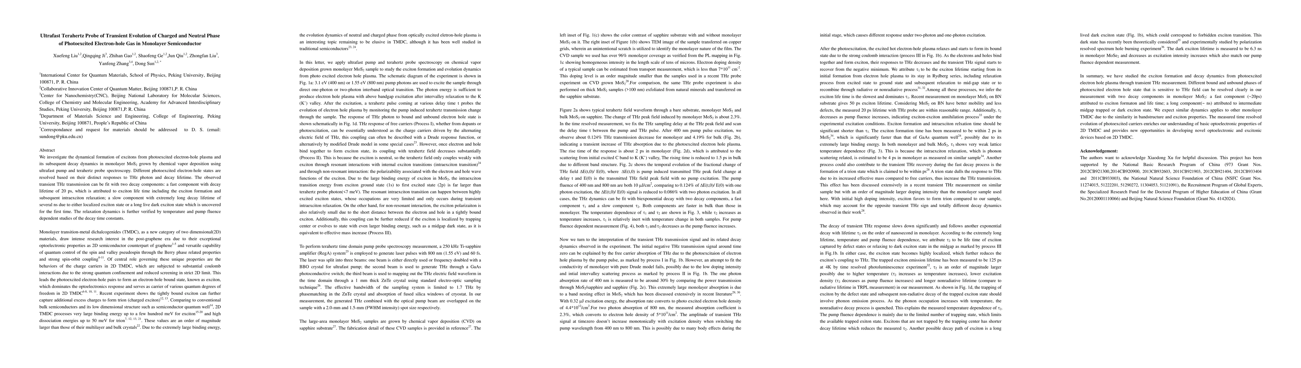This paper uses ultrafast pump and terahertz probe spectroscopy to study the transient evolution of photoexcited electron-hole gas in monolayer MoS2, revealing two decay components: a fast 20 ps decay attributed to exciton dynamics, and a slow decay of several ns linked to localized or dark exciton states. Temperature and pump fluence dependencies further validate the observed relaxation dynamics.