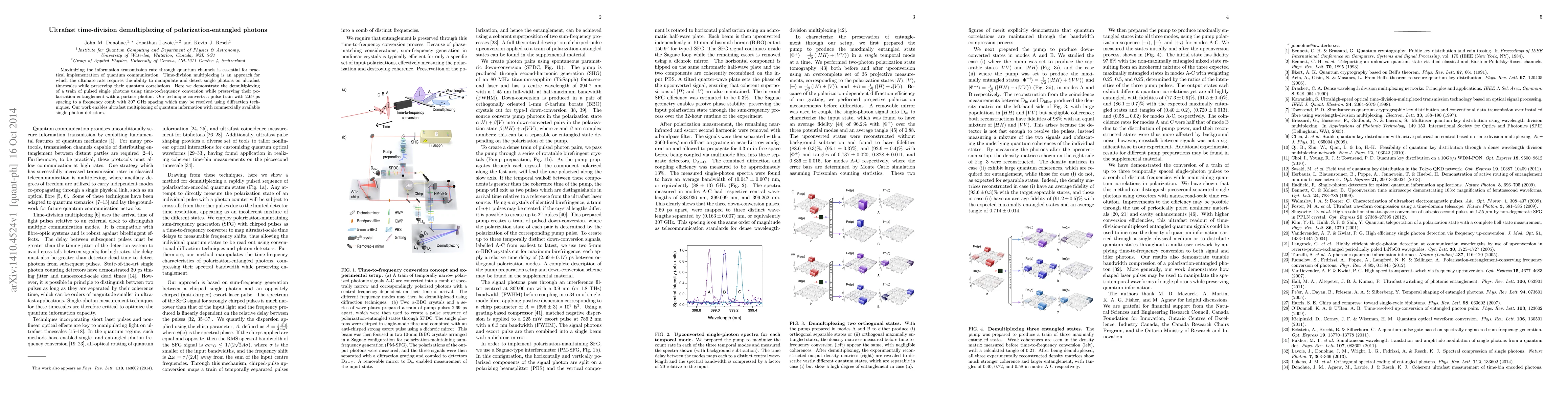 This paper presents an ultrafast time-division demultiplexing technique for polarization-entangled photons, converting a pulse train to a frequency comb while preserving quantum correlations, enabling practical quantum communication. The technique uses time-to-frequency conversion for efficient multiplexing of quantum information.