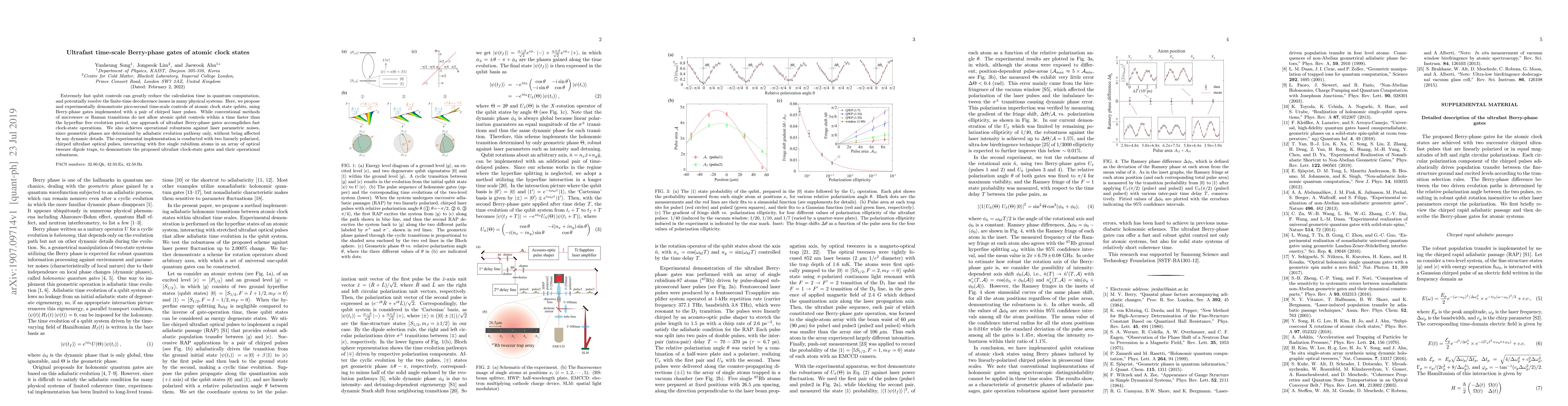 This paper proposes and demonstrates ultrafast pico-second time-scale controls of atomic clock state qubits using Berry-phase gates implemented with chirped laser pulses, achieving operational robustness against laser noise and resolving decoherence issues. The experimental setup uses rubidium atoms in optical traps to validate the effectiveness of the proposed method.