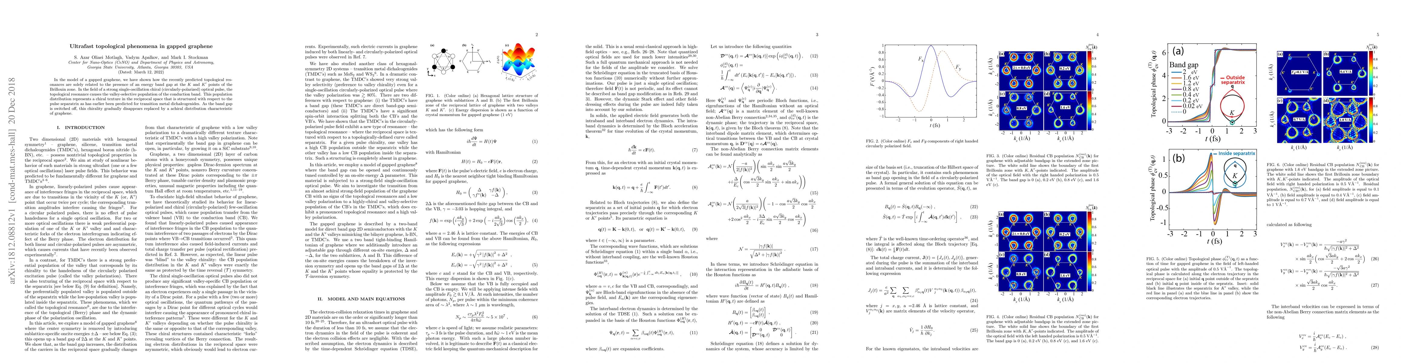 In the model of gapped graphene, we have shown how the recently predicted topological resonances are solely related to the presence of an energy band gap at the $K$ and $K^\prime$ points of the Brillouin zone. In the field of a strong single-oscillation chiral (circularly-polarized) optical pulse, the topological resonance causes the valley-selective population of the conduction band. This population distribution represents a chiral texture in the reciprocal space that is structured with respect to the pulse separatrix as has earlier been predicted for transition metal dichalcogenides. As the band gap is switched off, this chirality gradually disappears replaced by an achiral distribution characteristic of graphene.
