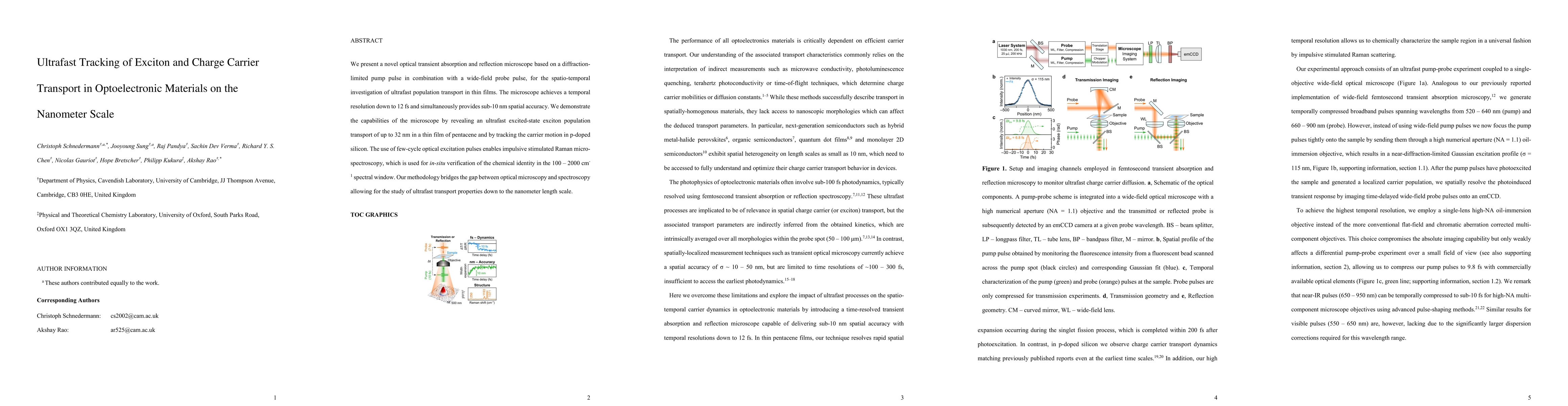 This paper introduces a high-resolution optical microscope for ultrafast tracking of exciton and charge transport in optoelectronic materials, achieving 12 fs temporal resolution and sub-10 nm spatial accuracy. The technique reveals ultrafast exciton transport in pentacene and carrier motion in silicon, bridging optical microscopy and spectroscopy for nanometer-scale studies.