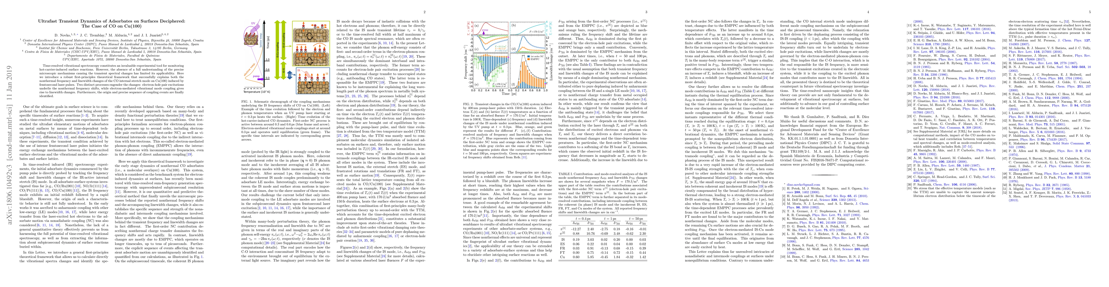 Time-resolved vibrational spectroscopy constitutes an invaluable experimental tool for monitoring hot-carrier induced surface reactions. However, the absence of a full understanding on the precise microscopic mechanisms causing the transient spectral changes has been limiting its applicability. Here we introduce a robust first-principles theoretical framework that successfully explains both the nonthermal frequency and linewidth changes of the CO internal stretch mode on Cu(100) induced by femtosecond laser pulses. Two distinct processes engender the changes: electron-hole pair excitations underlie the nonthermal frequency shifts, while electron-mediated vibrational mode coupling gives rise to linewidth changes. Furthermore, the origin and precise sequence of coupling events are finally identified.