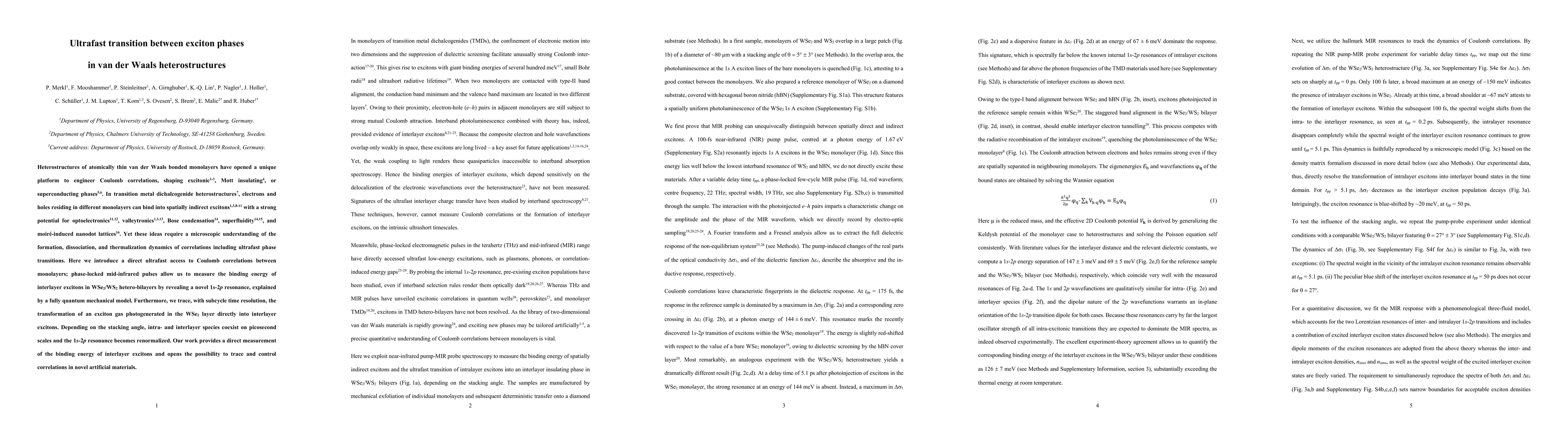 The study explores ultrafast transitions between exciton phases in van der Waals heterostructures, utilizing phase-locked mid-infrared pulses to measure interlayer exciton binding energy in WSe2/WS2 hetero-bilayers, revealing a 1s-2p resonance and demonstrating picosecond-scale coexistence of intra- and interlayer excitons. This research enables direct observation and control of Coulomb correlations in artificial materials.