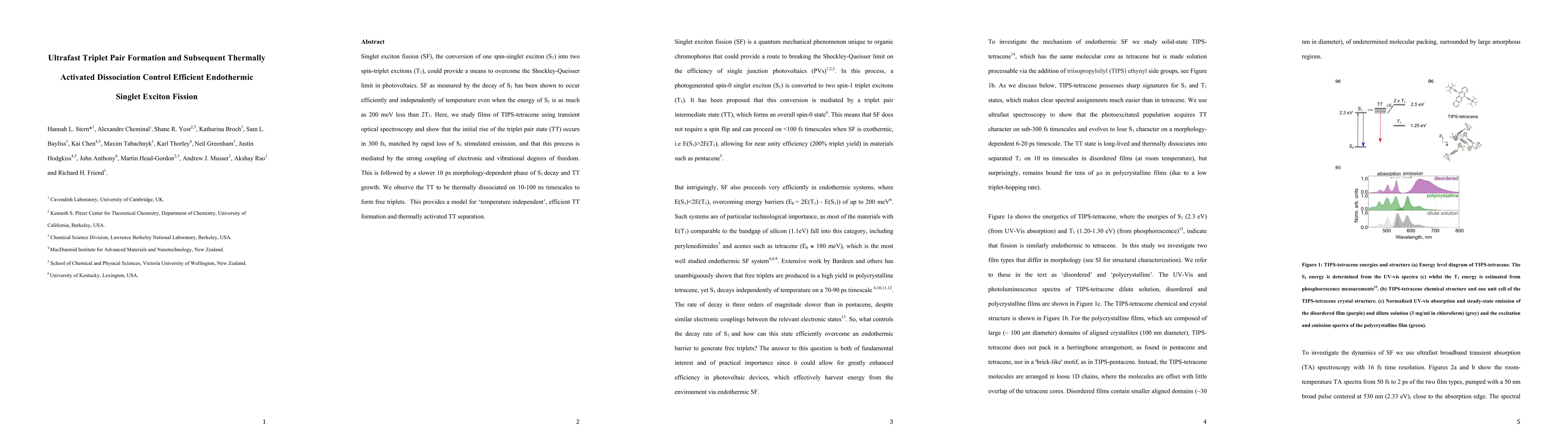 This paper investigates efficient singlet exciton fission in TIPS-tetracene films, demonstrating ultrafast triplet pair formation within 300 fs and subsequent thermally activated dissociation over 10-100 ns, suggesting a pathway to surpass the Shockley-Queisser limit in photovoltaics.