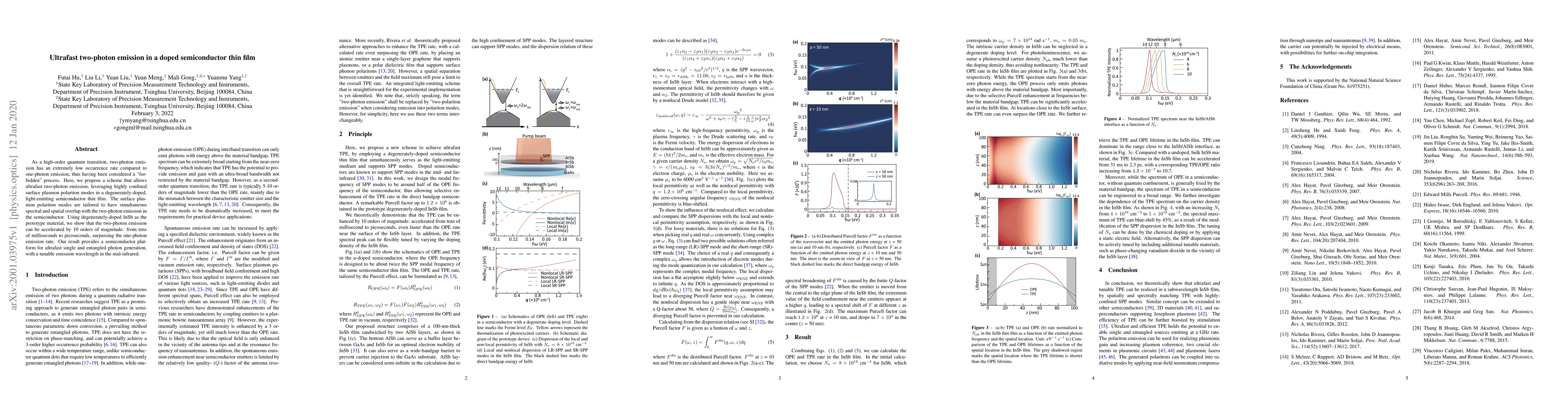 This paper proposes a method to achieve ultrafast two-photon emission in a degenerately-doped semiconductor thin film by utilizing surface plasmon polariton modes. The technique accelerates two-photon emission from milliseconds to picoseconds, significantly outperforming the one-photon emission rate, thus enabling ultrafast single and entangled photon generation in the mid-infrared.