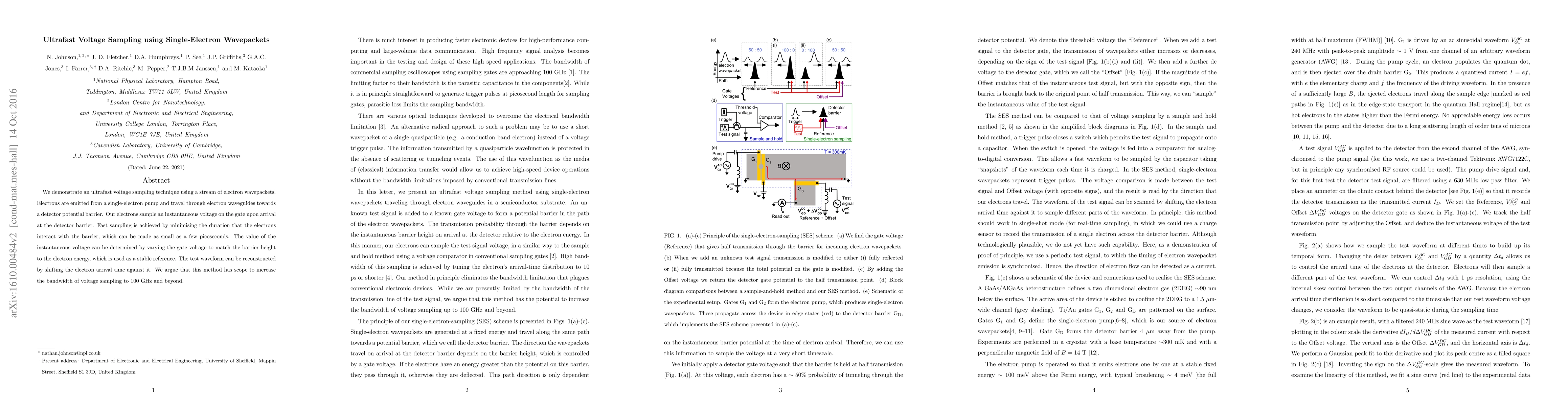 This paper presents an ultrafast voltage sampling technique utilizing single-electron wavepackets, achieving picosecond-scale sampling by minimizing electron interaction with a detector barrier. The method reconstructs test waveforms by correlating electron arrival times, with potential for bandwidths exceeding 100 GHz.
