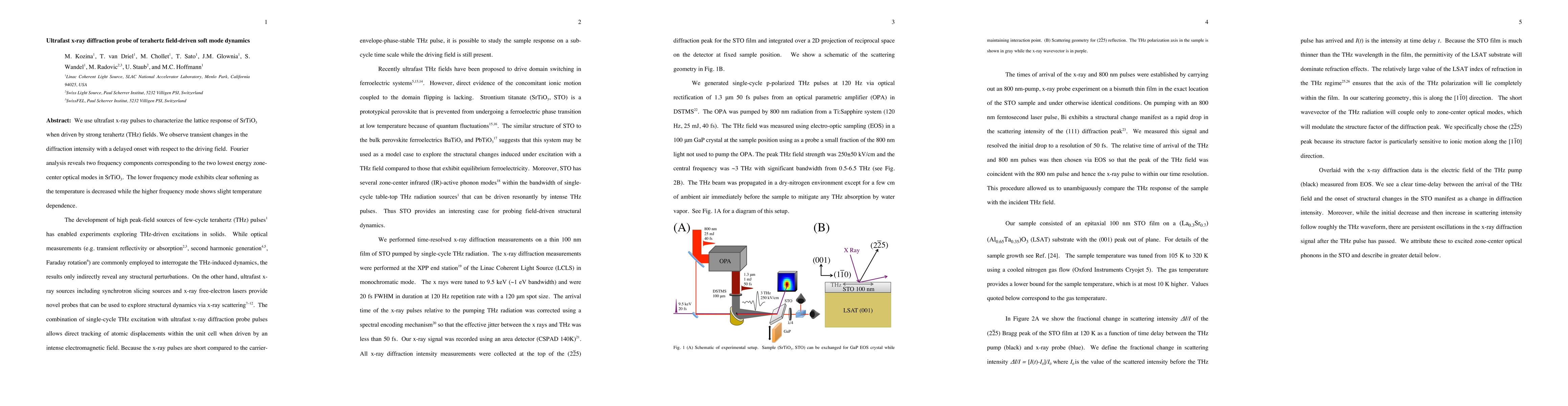 This study employs ultrafast x-ray pulses to investigate the lattice response of SrTiO3 under strong terahertz fields, revealing transient diffraction changes with delayed onset. Fourier analysis identifies two optical modes, with the lower frequency mode softening as temperature decreases.