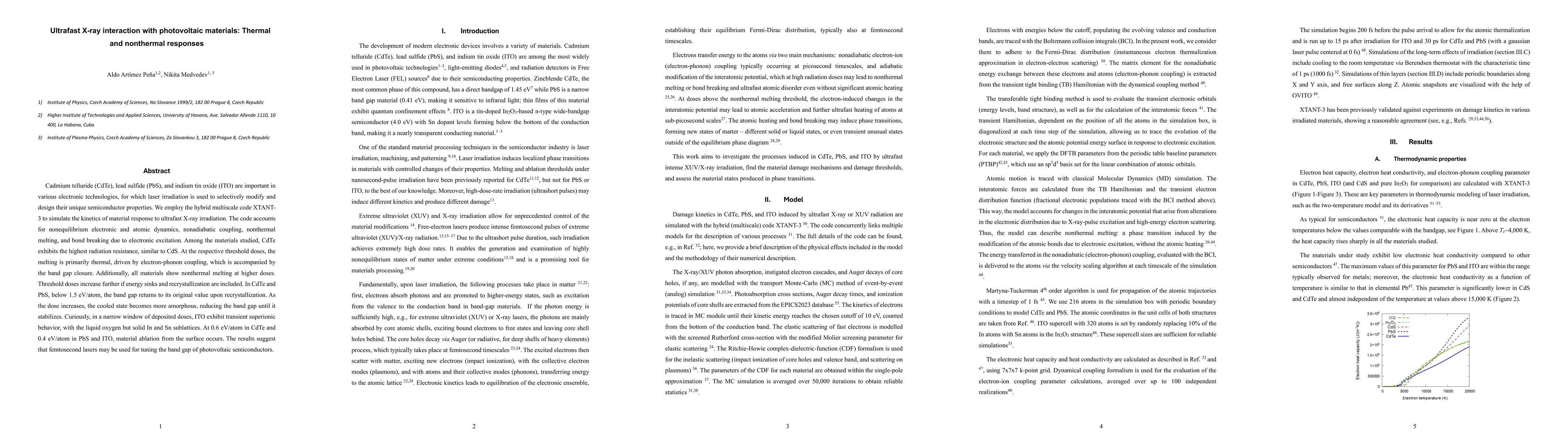Cadmium telluride (CdTe), lead sulfide (PbS), and indium tin oxide (ITO) are important in various electronic technologies, for which laser irradiation is used to selectively modify and design their unique semiconductor properties. We employ the hybrid multiscale code XTANT-3 to simulate the kinetics of material response to ultrafast X-ray irradiation. The code accounts for nonequilibrium electronic and atomic dynamics, nonadiabatic coupling, nonthermal melting, and bond breaking due to electronic excitation. Among the materials studied, CdTe exhibits the highest radiation resistance, similar to CdS. At the respective threshold doses, the melting is primarily thermal, driven by electron-phonon coupling, which is accompanied by the band gap closure. Additionally, all materials show nonthermal melting at higher doses. Threshold doses increase further if energy sinks and recrystallization are included. In CdTe and PbS, below 1.5 eV/atom, the band gap returns to its original value upon recrystallization. As the dose increases, the cooled state becomes more amorphous, reducing the band gap until it stabilizes. Curiously, in a narrow window of deposited doses, ITO exhibit transient superionic behavior, with the liquid oxygen but solid In and Sn sublattices. At 0.6 eV/atom in CdTe and 0.4 eV/atom in PbS and ITO, material ablation from the surface occurs. The results suggest that femtosecond lasers may be used for tuning the band gap of photovoltaic semiconductors.