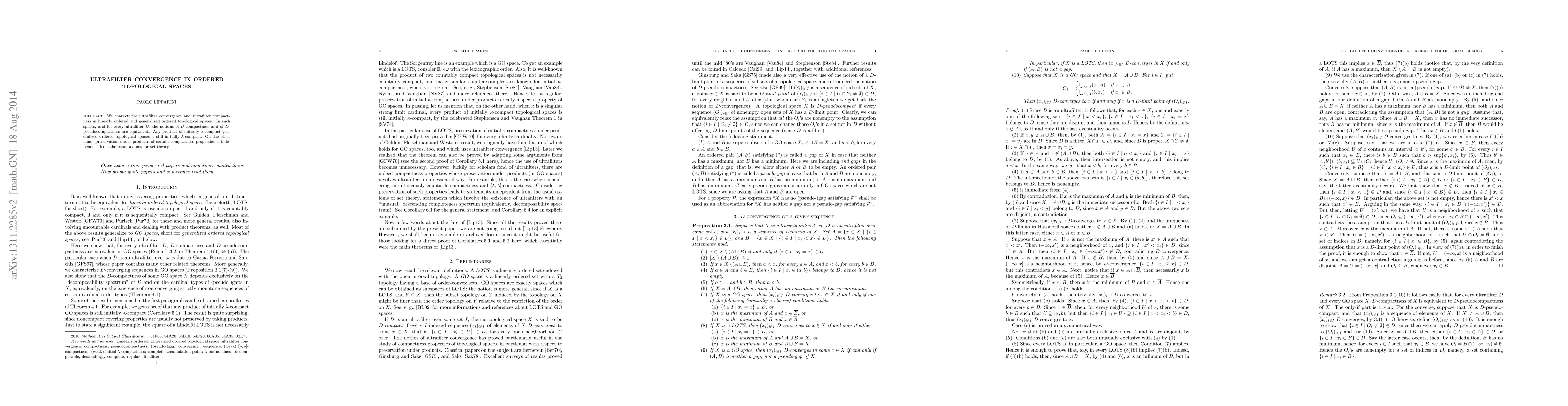 Summary: This paper characterizes ultrafilter convergence and compactness in ordered topological spaces, showing that $D$-compactness and $D$-pseudocompactness are equivalent. It also discusses the product properties of initially $\lambda$-compact spaces and notes that preservation under products of certain compactness properties is independent of standard set theory axioms.
