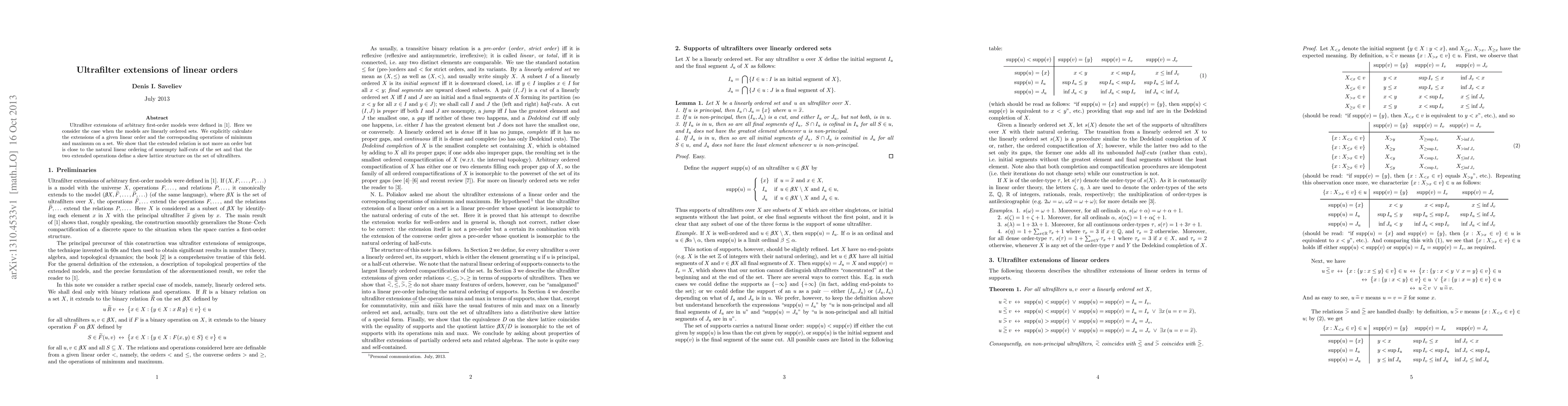 It was recently shown that arbitrary first-order models canonically extend to models (of the same language) consisting of ultrafilters. The main precursor of this construction was the extension of semigroups to semigroups of ultrafilters, a technique allowing to obtain significant results in algebra and dynamics. Here we consider another particular case where the models are linearly ordered sets. We explicitly calculate the extensions of a given linear order and the corresponding operations of minimum and maximum on a set. We show that the extended relation is not more an order however is close to the natural linear ordering of nonempty half-cuts of the set and that the two extended operations define a skew lattice structure on the set of ultrafilters.
