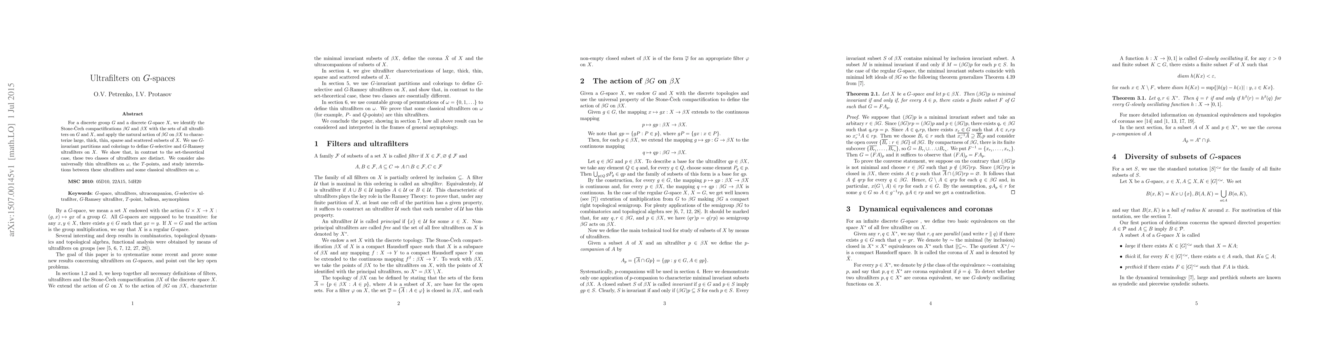 For a discrete group $G$ and a discrete $G$-space $X$, we identify the Stone-\v{C}ech compactifications $\beta G$ and $\beta X$ with the sets of all ultrafilters on $G$ and $X$, and apply the natural action of $\beta G$ on $\beta X$ to characterize large, thick, thin, sparse and scattered subsets of $X$. We use $G$-invariant partitions and colorings to define $G$-selective and $G$-Ramsey ultrafilters on $X$. We show that, in contrast to the set-theoretical case, these two classes of ultrafilters are distinct. We consider also universally thin ultrafilters on $\omega$, the $T$-points, and study interrelations between these ultrafilters and some classical ultrafilters on $\omega$.