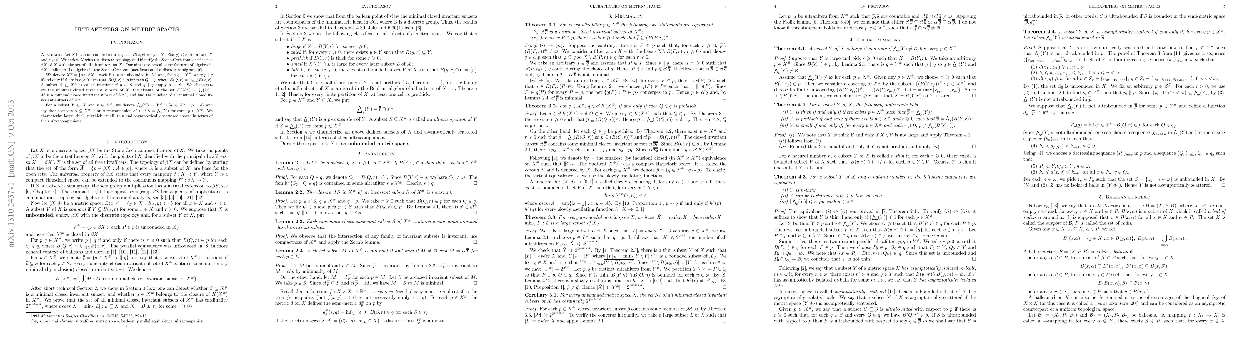 Let $X$ be an unbounded metric space, $B(x,r) = \{y\in X: d(x,y) \leqslant r\}$ for all $x\in X$ and $r\geqslant 0$. We endow $X$ with the discrete topology and identify the Stone-\v{C}ech compactification $\beta X$ of $X$ with the set of all ultrafilters on $X$. Our aim is to reveal some features of algebra in $\beta X$ similar to the algebra in the Stone-\v{C}ech compactification of a discrete semigroup \cite{b6}. We denote $X^# = \{p\in \beta X: \mbox{each}P\in p\mbox{is unbounded in}X\}$ and, for $p,q \in X^#$, write $p\parallel q$ if and only if there is $r \geqslant 0$ such that $B(Q,r)\in p$ for each $Q\in q$, where $B(Q, r)=\cup_{x\in Q}B(x,r)$. A subset $S\subseteq X^#$ is called invariant if $p\in S$ and $q\parallel p$ imply $q\in S$. We characterize the minimal closed invariant subsets of $X$, the closure of the set $K(X^#) = \bigcup\{M : M\mbox{is a minimal closed invariant subset of}X^#\}$, and find the number of all minimal closed invariant subsets of $X^#$. For a subset $Y\subseteq X$ and $p\in X^#$, we denote $\bigtriangleup_p(Y) = Y^# \cap \{q\in X^#: p \parallel q\}$ and say that a subset $S\subseteq X^#$ is an ultracompanion of $Y$ if $S = \bigtriangleup_p(Y)$ for some $p\in X^#$. We characterize large, thick, prethick, small, thin and asymptotically scattered spaces in terms of their ultracompanions.